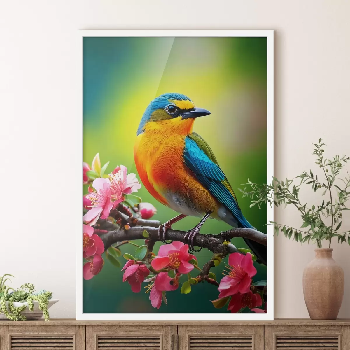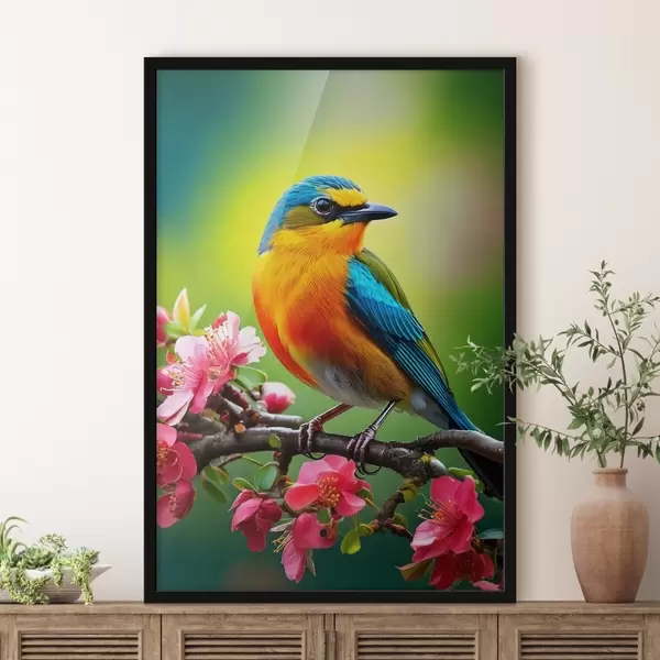 Plakatas ryškus paukštis ant šakos su gėlėmis f41412