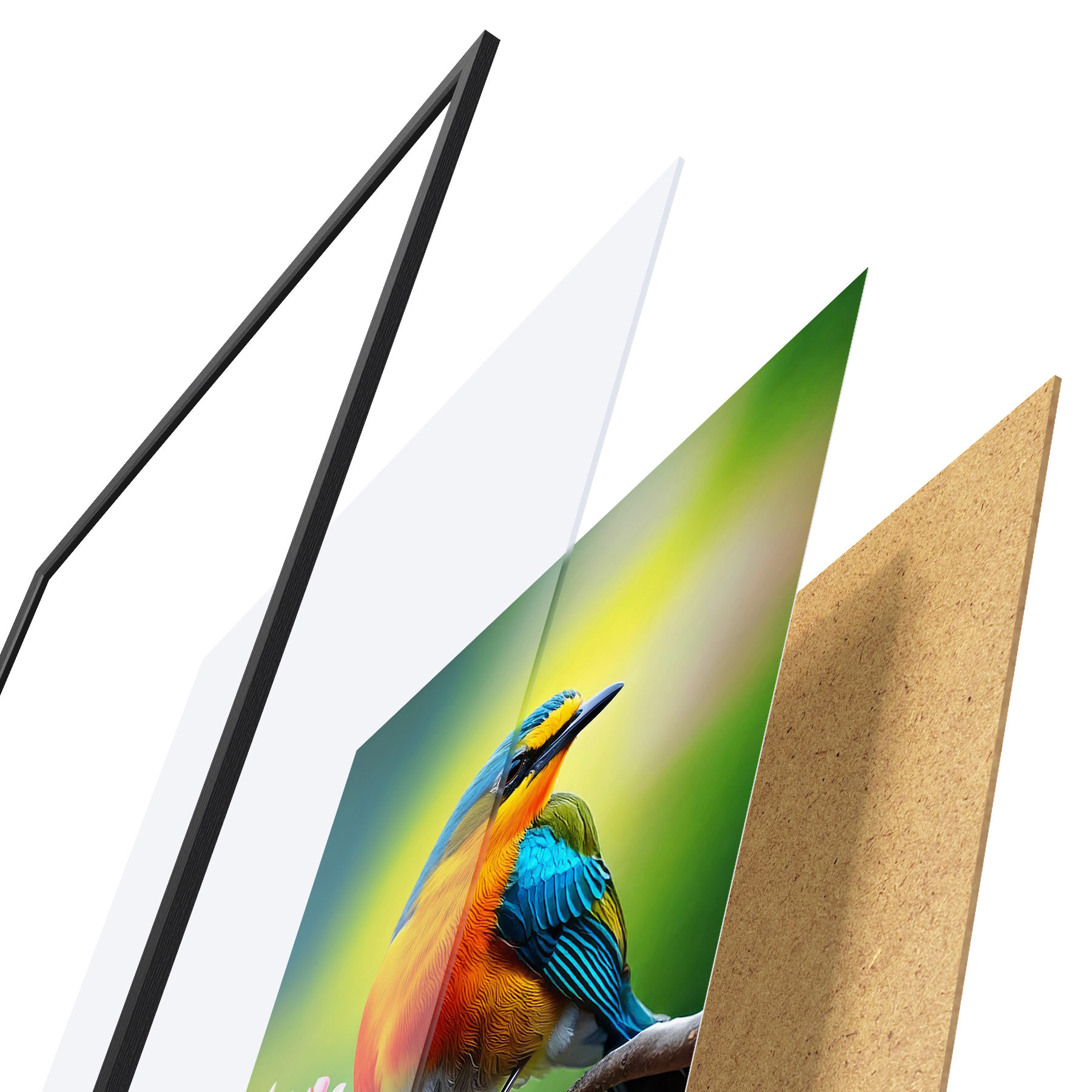 Plakatą sudaro rėmas, pleksiklas, atspausdintas vaizdas ir medžio drožlių plokštės pagrindas. Plakatą galima iš karto pakabinti ant sienos dėl kitoje pusėje esančių laikiklių.