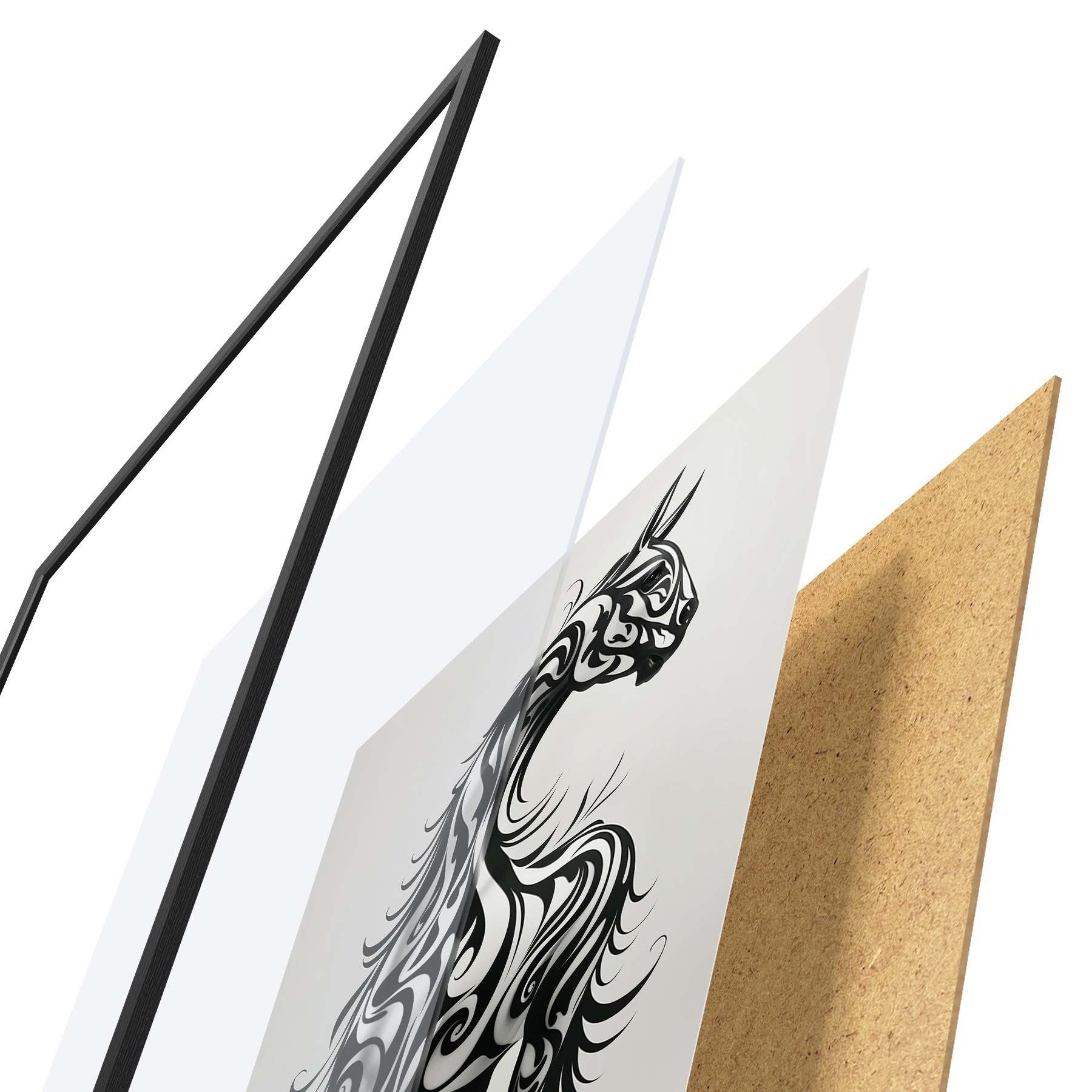 Plakatą sudaro rėmas, pleksiklas, atspausdintas vaizdas ir medžio drožlių plokštės pagrindas. Plakatą galima iš karto pakabinti ant sienos dėl kitoje pusėje esančių laikiklių.