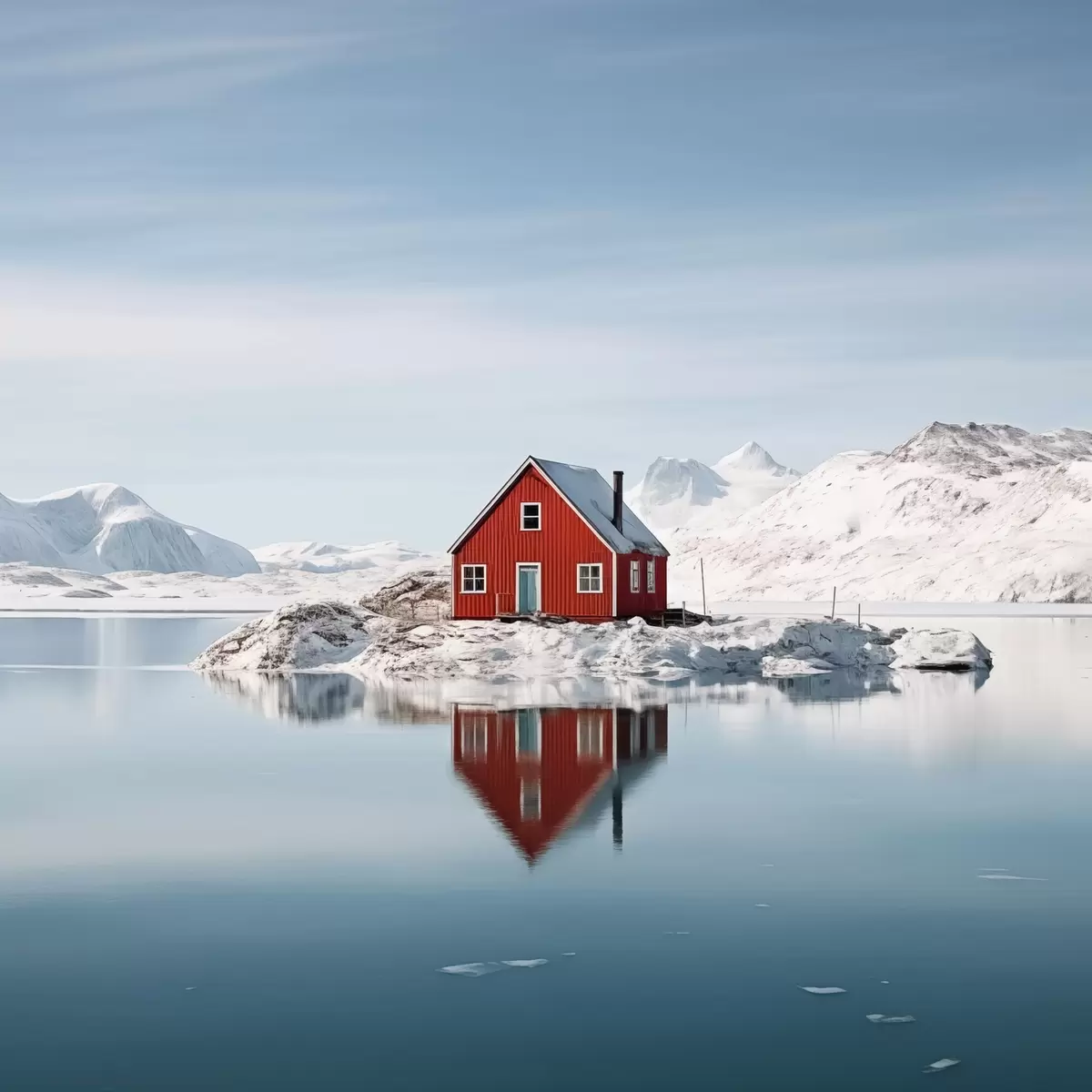 Plakatas Minimalistinis žiemos kraštovaizdis raudonas namas prie ežero f41437
