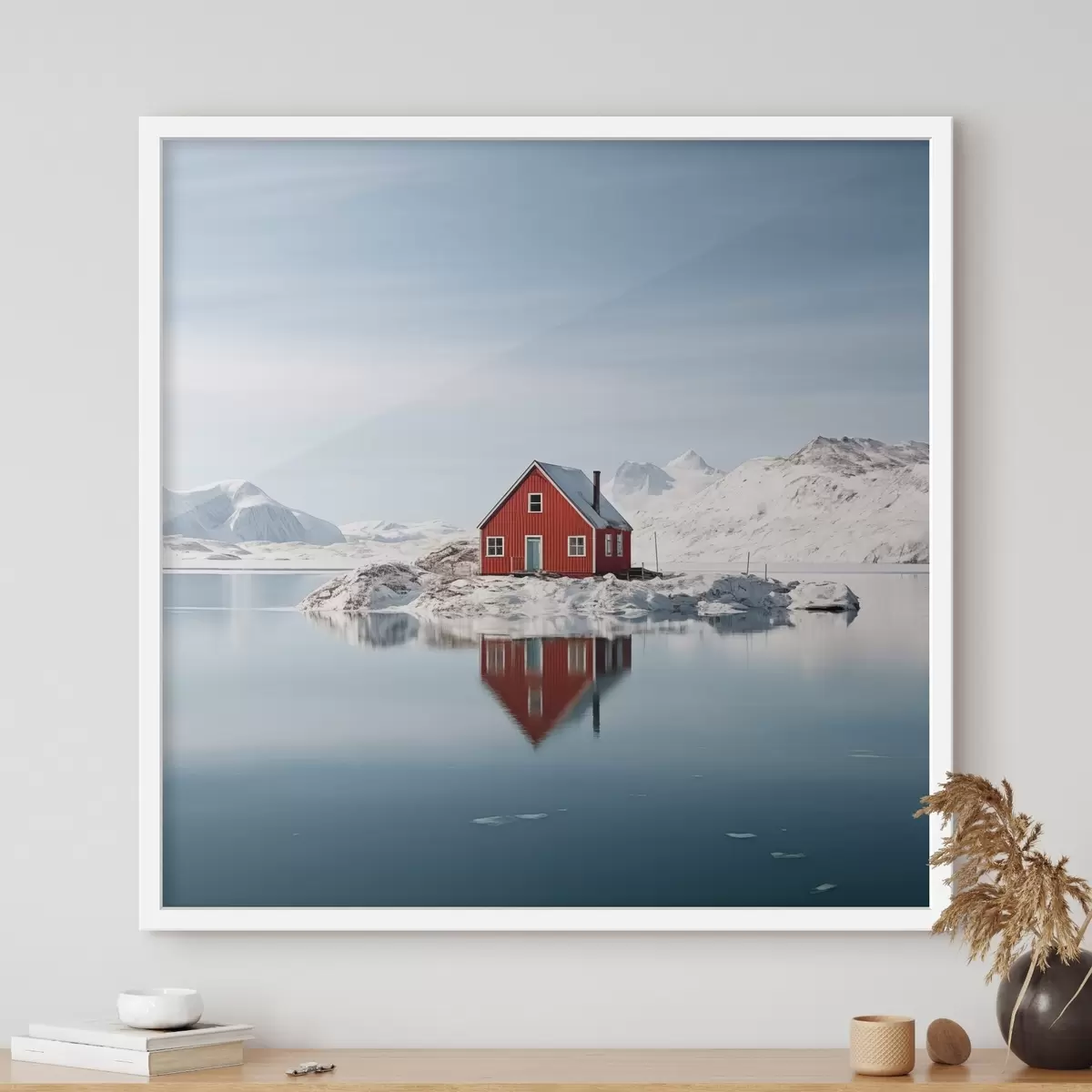 Plakatas Minimalistinis žiemos kraštovaizdis raudonas namas prie ežero Ne f41437