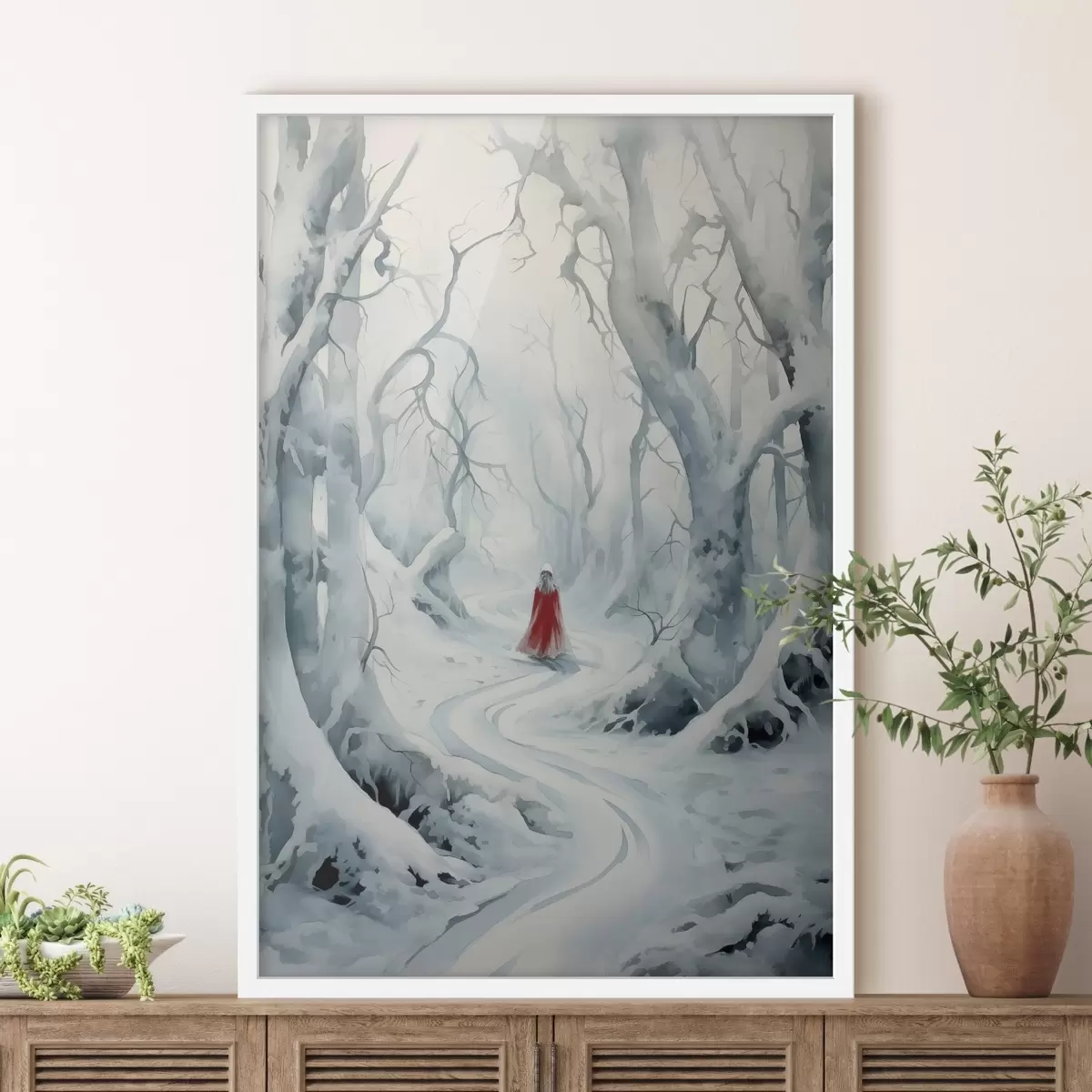 Plakatas Vyras raudonu apsiaustu viduryje žiemos miško Ne f41438