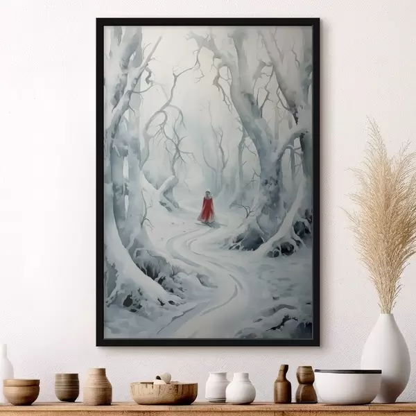 Plakatas Vyras raudonu apsiaustu viduryje žiemos miško f41438