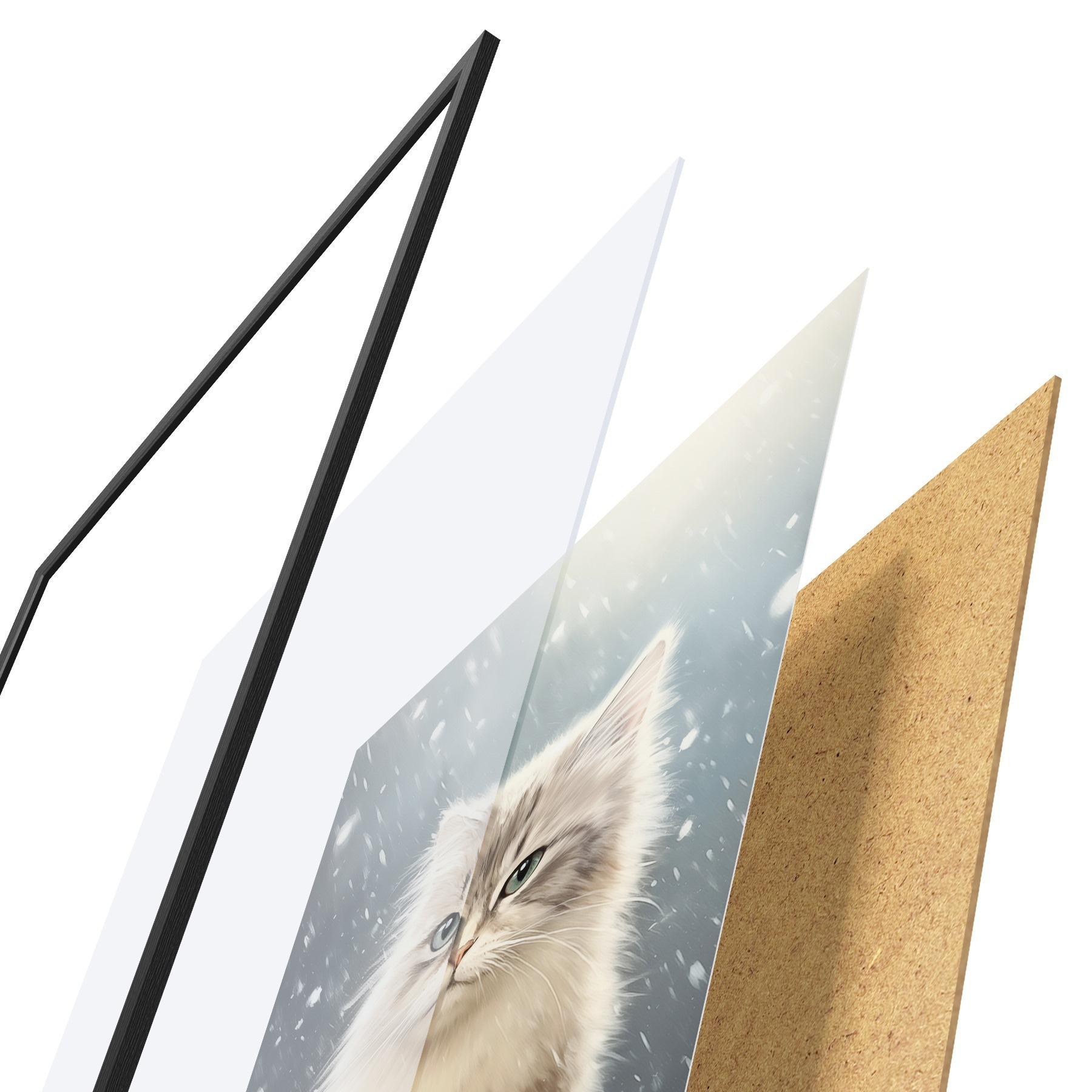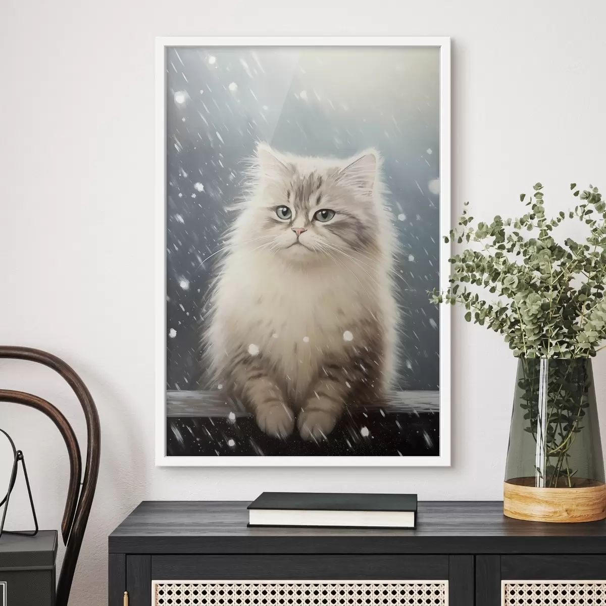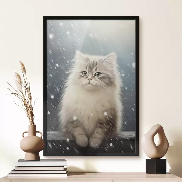 Plakatas Pūkuotas kačiukas sėdi po krentančiu sniegu Ne f41440