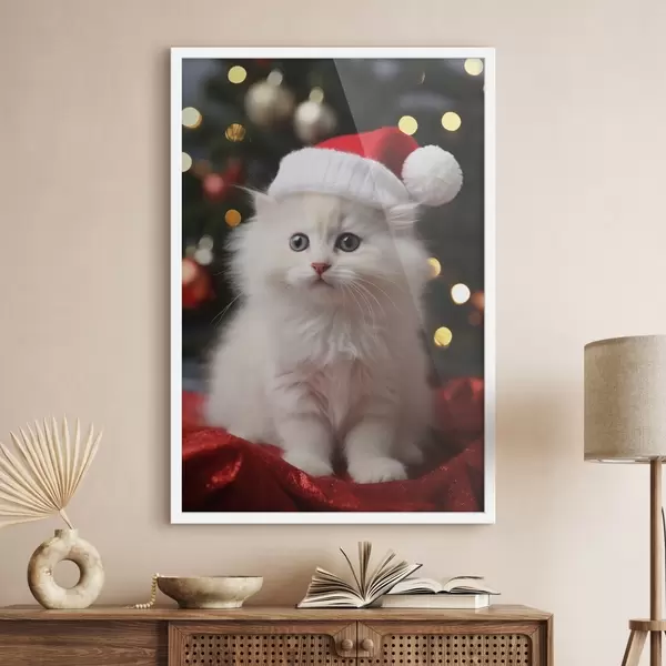 Plakatas Baltas pūkuotas kačiukas su raudona kalėdine kepure f41442
