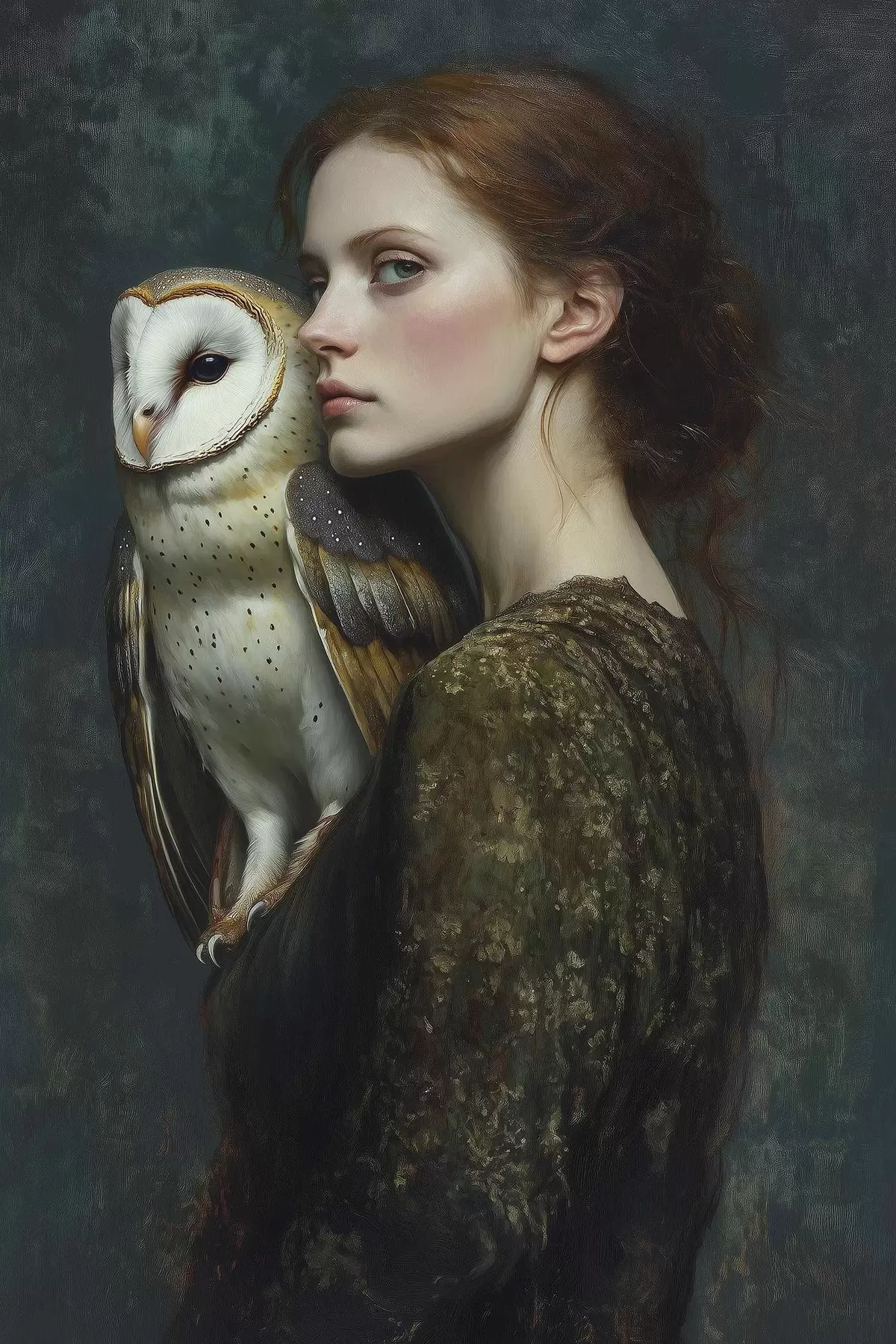 Plakatas Moters portretas su pelėda ant peties, teptuko potėpiai, akrilas f41447