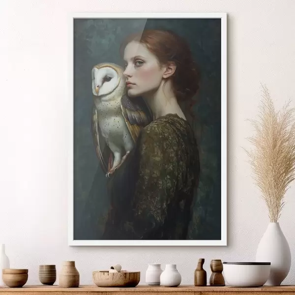 Plakatas Moters portretas su pelėda ant peties, teptuko potėpiai, akrilas Ne f41447