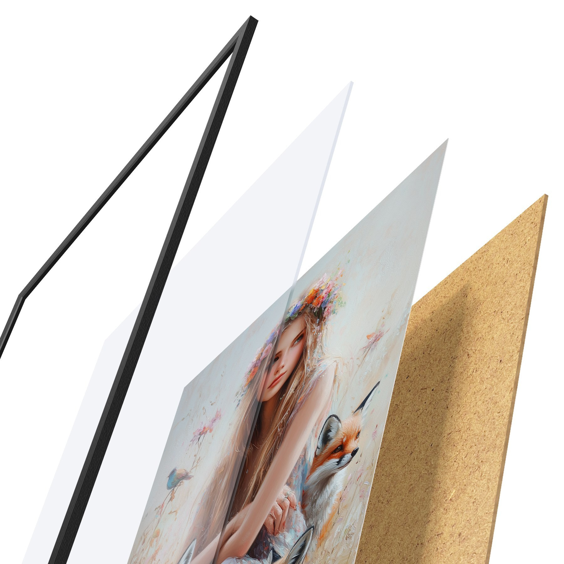 Plakatas Mergaitė pievoje, laukiniai gyvūnai, lapės, paukščiai, gėlių vainikas Ne f41451