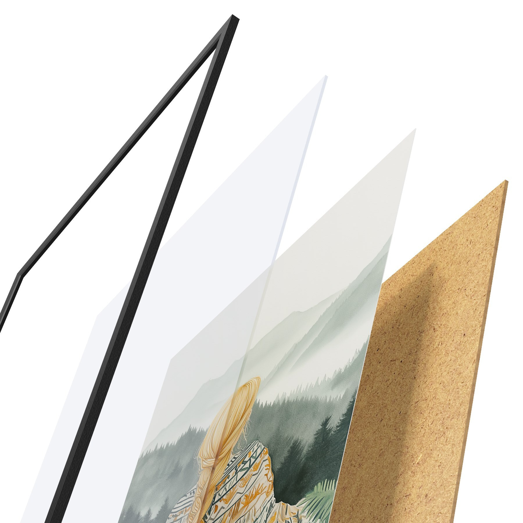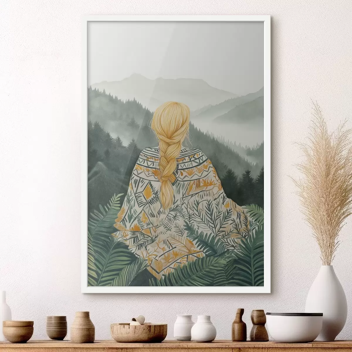 Plakatas Kalnai peizažai, miškas, mergaitė antklodėje, kelionės, gamta f41452
