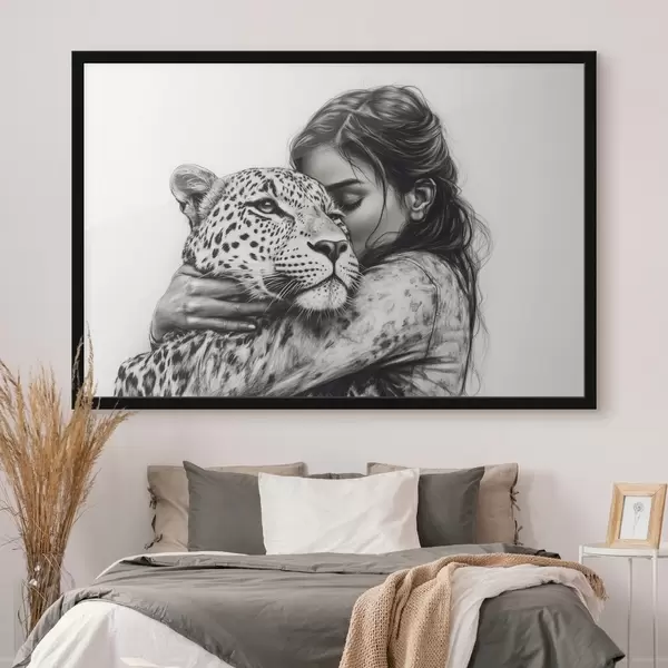Plakatas Moteris su leopardu, laukiniai gyvūnai, piešinys pieštuku, juodai balta Ne f41455