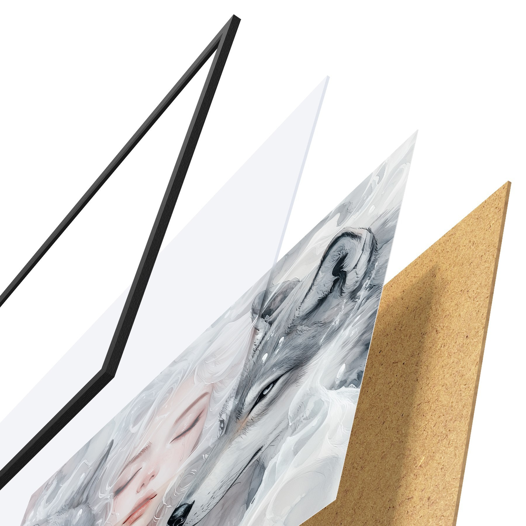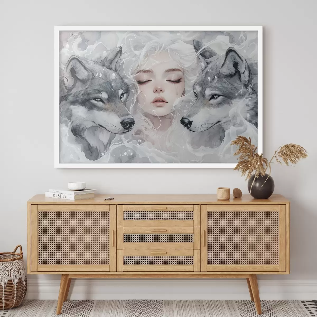 Plakatas Graži mergaitė su pilkais vilkais, anime stilius, švelnios pastelinės spalvos Ne f41458
