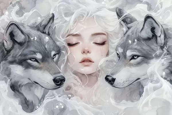 Plakatas Graži mergaitė su pilkais vilkais, anime stilius, švelnios pastelinės spalvos Ne f41458