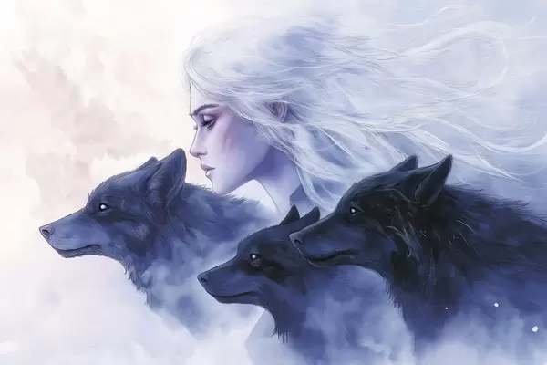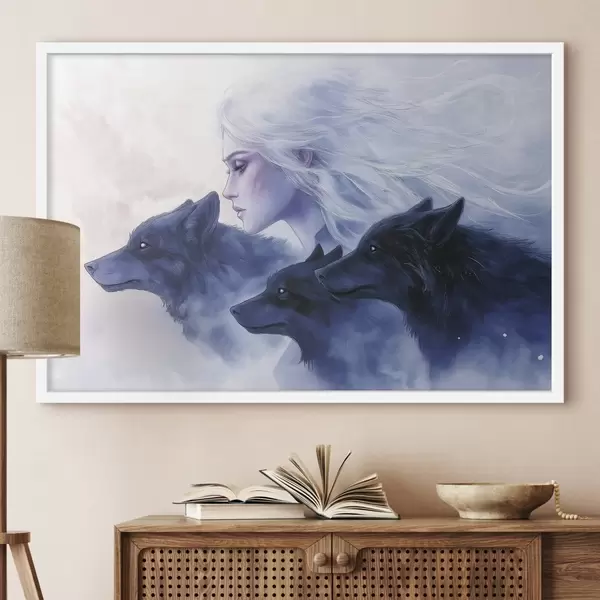 Plakatas Žiema, moteris su vilkais, rūkas, paslaptingas f41460