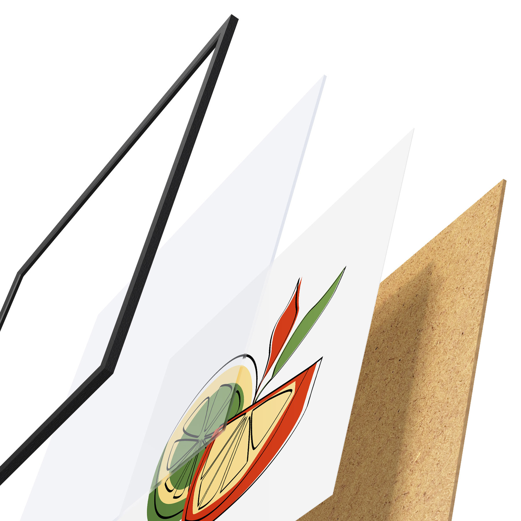 Plakatą sudaro rėmas, pleksiklas, atspausdintas vaizdas ir medžio drožlių plokštės pagrindas. Plakatą galima iš karto pakabinti ant sienos dėl kitoje pusėje esančių laikiklių.