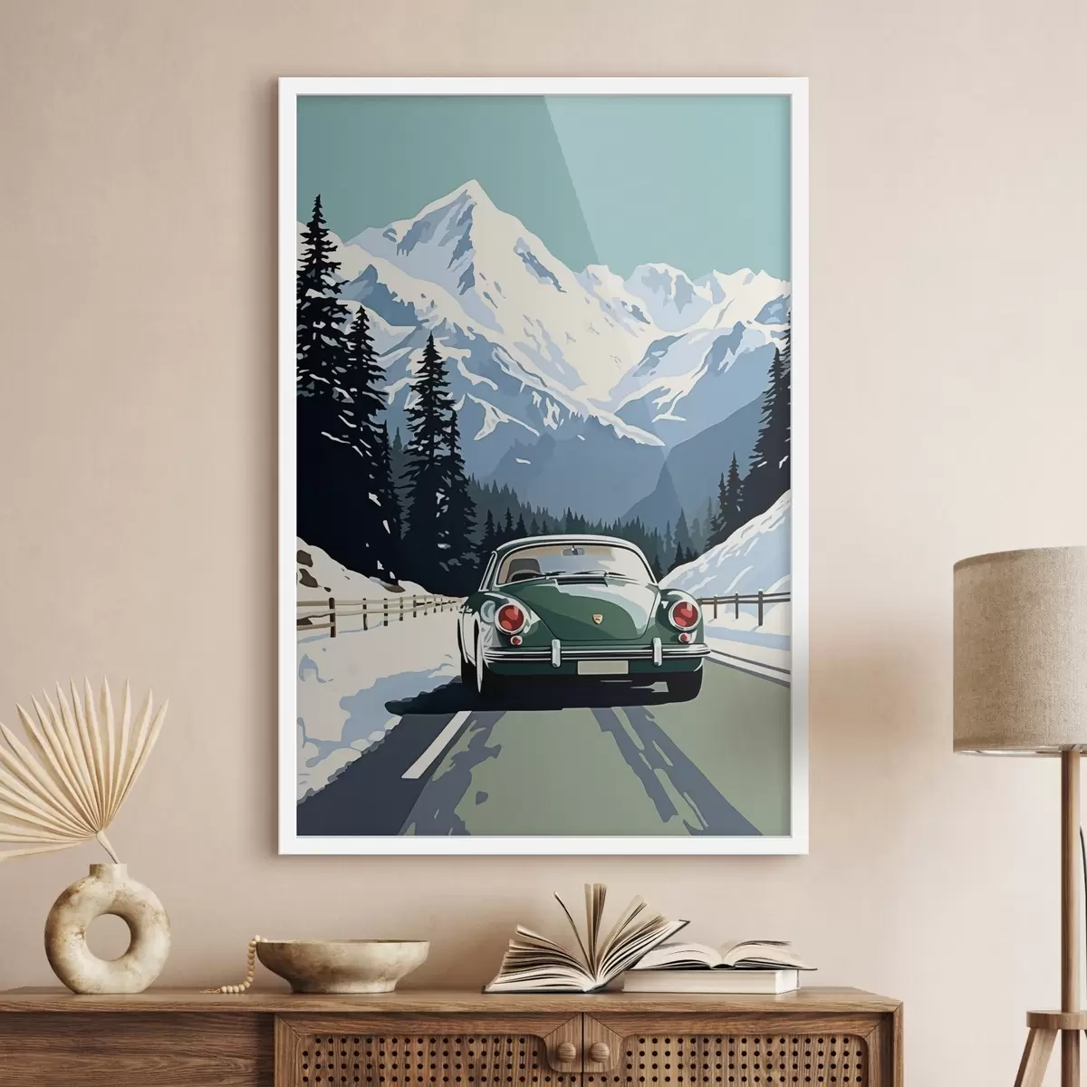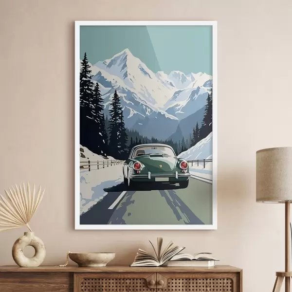 Plakatas Retro automobilis žiemos kalnų kelyje Ne f41478