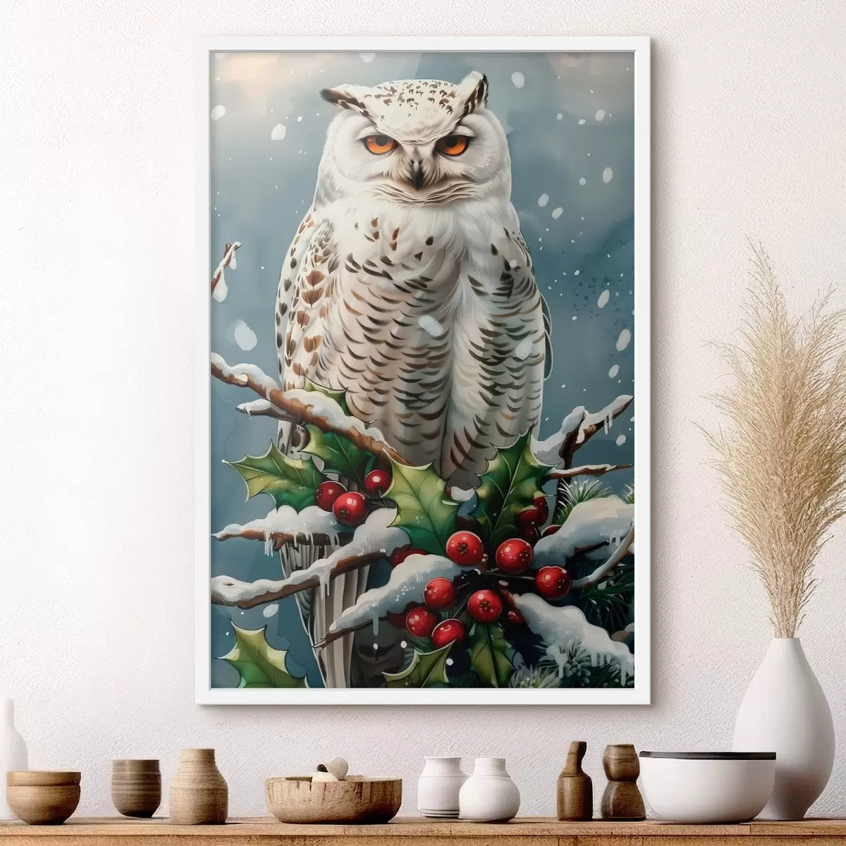 Plakatas Pelėda ant žiemos šakos su uogomis ir lapais f41482
