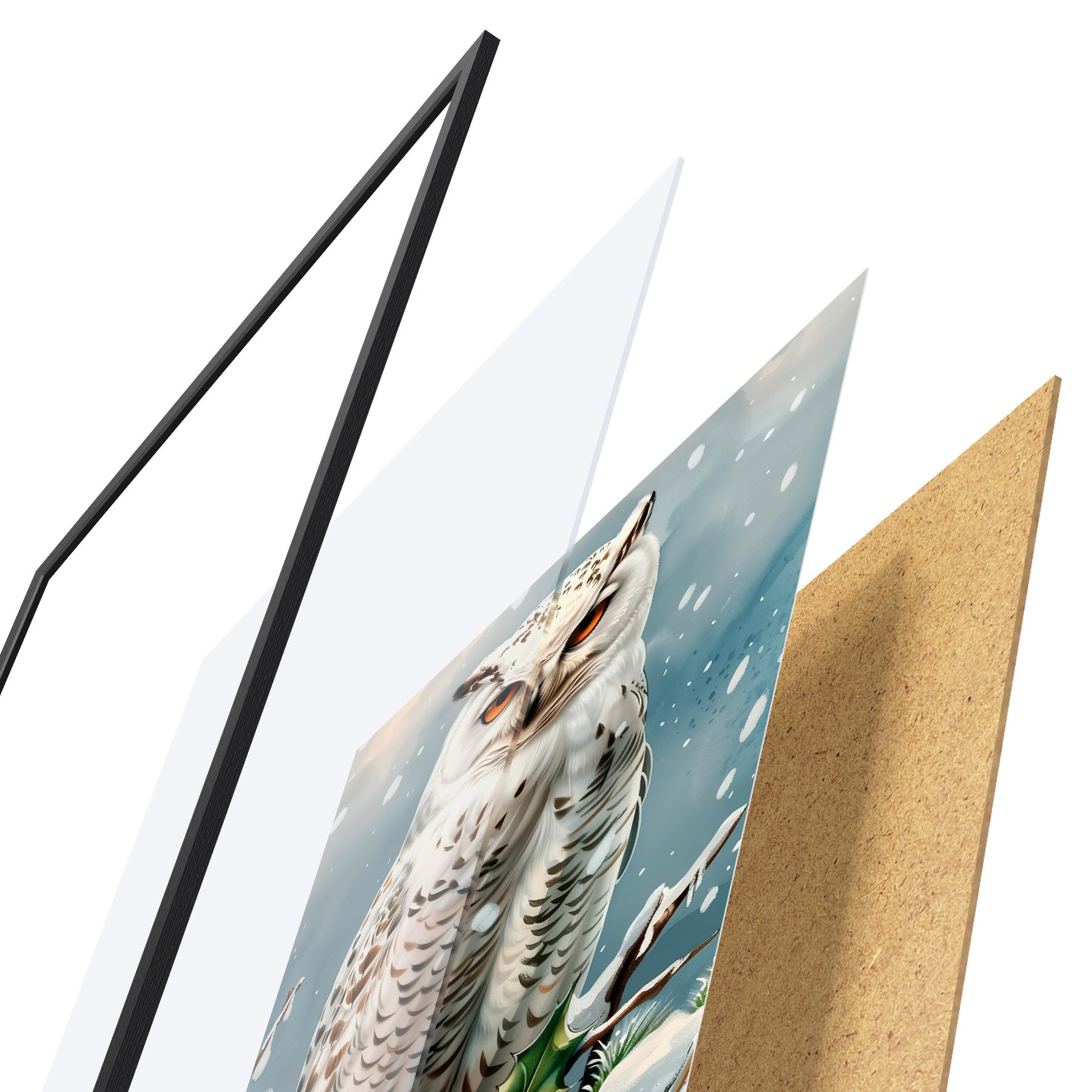 Plakatą sudaro rėmas, pleksiklas, atspausdintas vaizdas ir medžio drožlių plokštės pagrindas. Plakatą galima iš karto pakabinti ant sienos dėl kitoje pusėje esančių laikiklių.