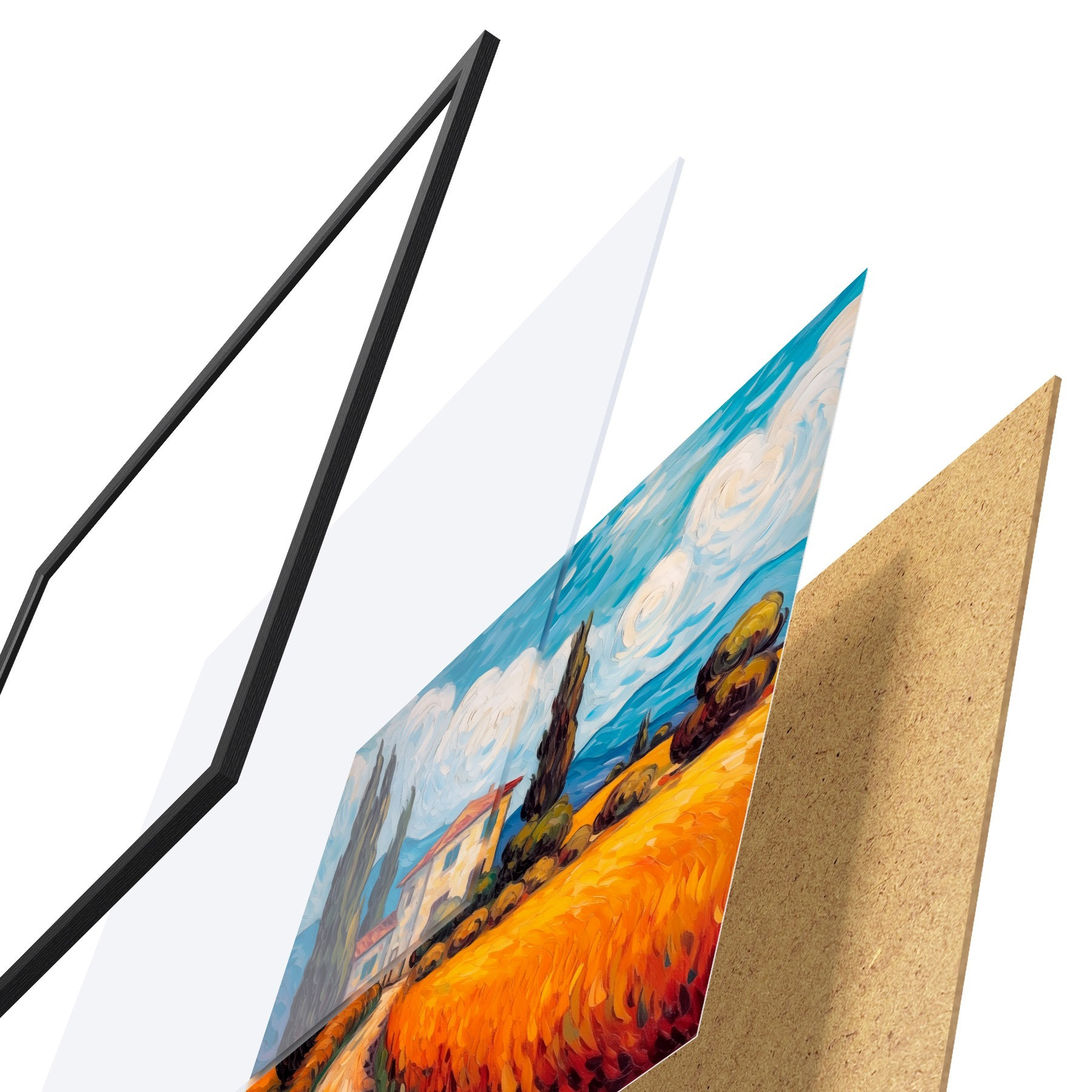Plakatą sudaro rėmas, pleksiklas, atspausdintas vaizdas ir medžio drožlių plokštės pagrindas. Plakatą galima iš karto pakabinti ant sienos dėl kitoje pusėje esančių laikiklių.
