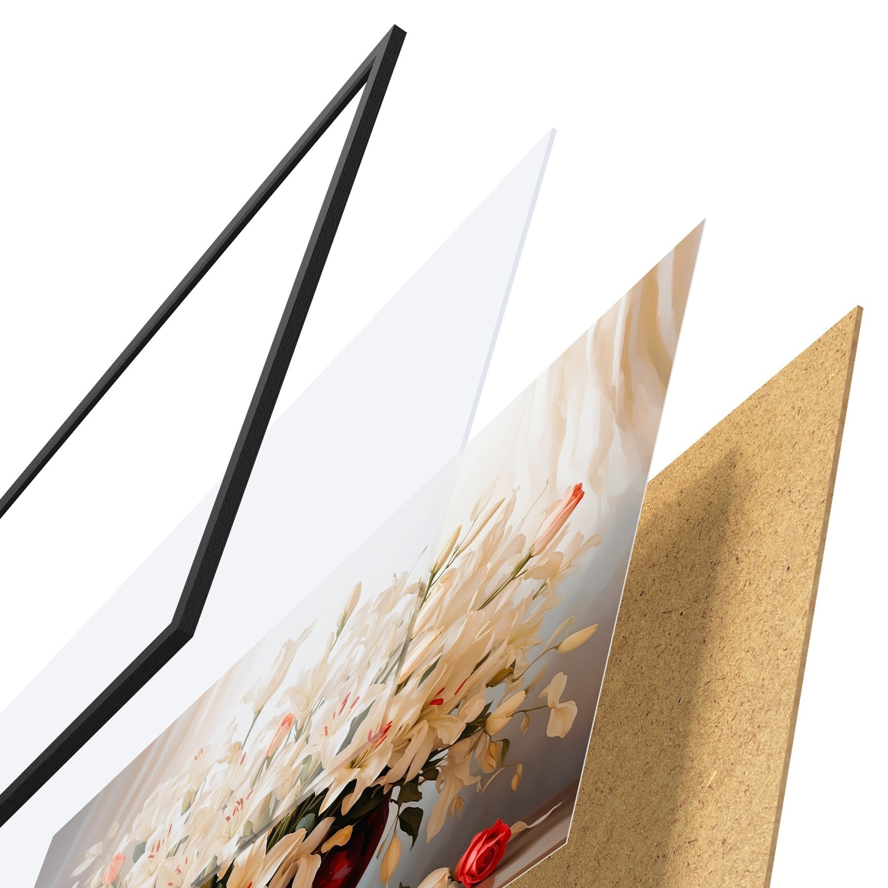 Plakatą sudaro rėmas, pleksiklas, atspausdintas vaizdas ir medžio drožlių plokštės pagrindas. Plakatą galima iš karto pakabinti ant sienos dėl kitoje pusėje esančių laikiklių.