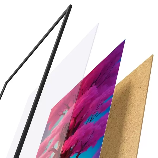 Plakatą sudaro rėmas, pleksiklas, atspausdintas vaizdas ir medžio drožlių plokštės pagrindas. Plakatą galima iš karto pakabinti ant sienos dėl kitoje pusėje esančių laikiklių.