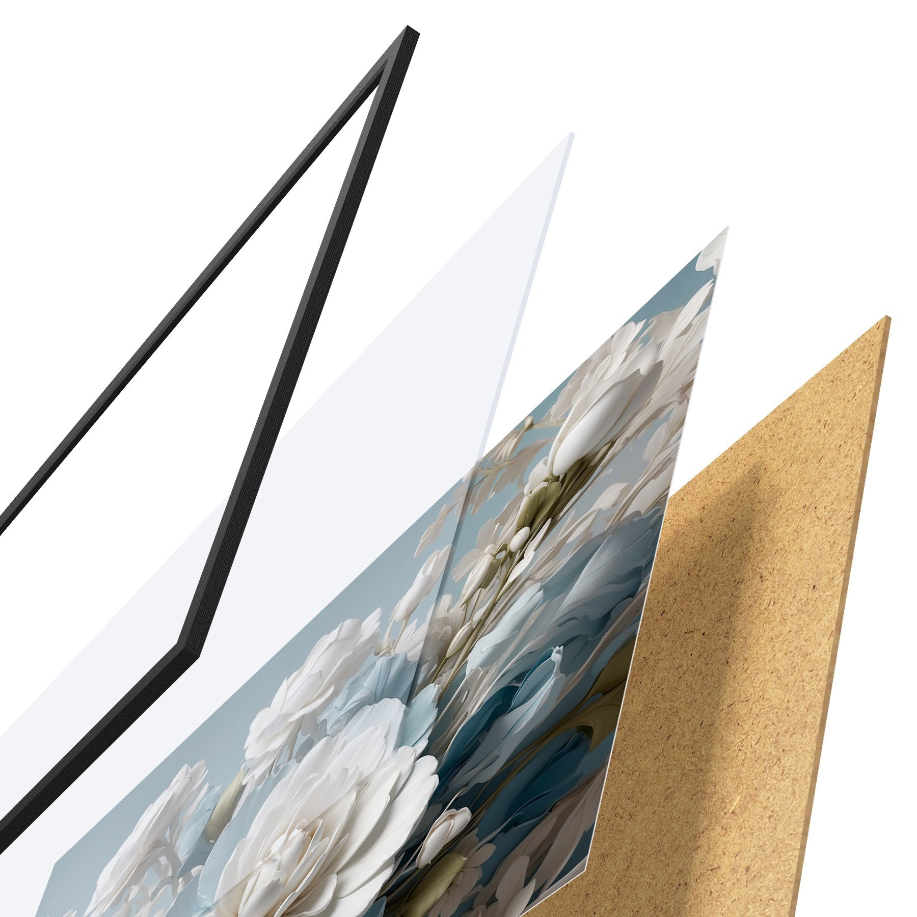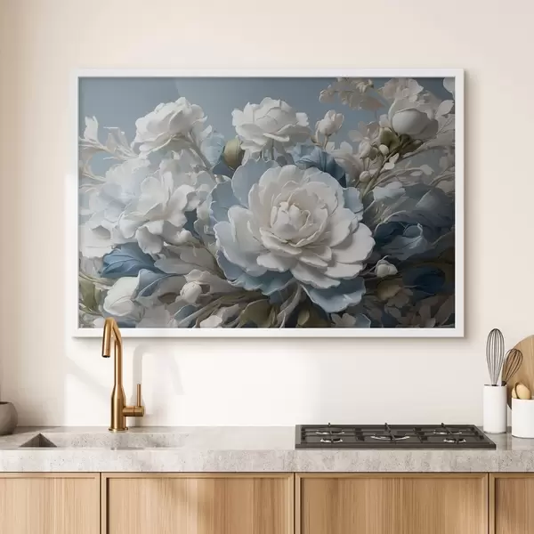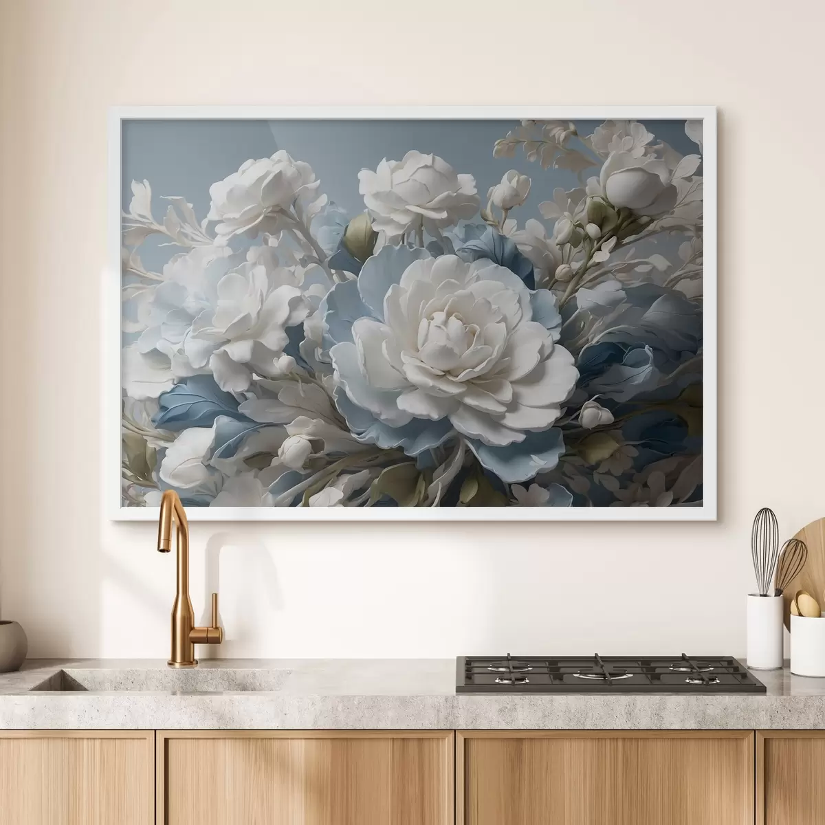 Plakatas Baltos gėlės ir lapai mėlyname fone f41527