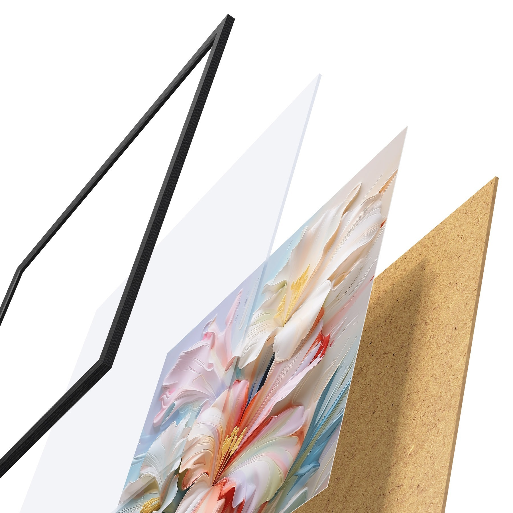 Plakatą sudaro rėmas, pleksiklas, atspausdintas vaizdas ir medžio drožlių plokštės pagrindas. Plakatą galima iš karto pakabinti ant sienos dėl kitoje pusėje esančių laikiklių.