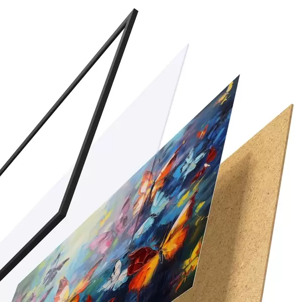 Plakatą sudaro rėmas, pleksiklas, atspausdintas vaizdas ir medžio drožlių plokštės pagrindas. Plakatą galima iš karto pakabinti ant sienos dėl kitoje pusėje esančių laikiklių.