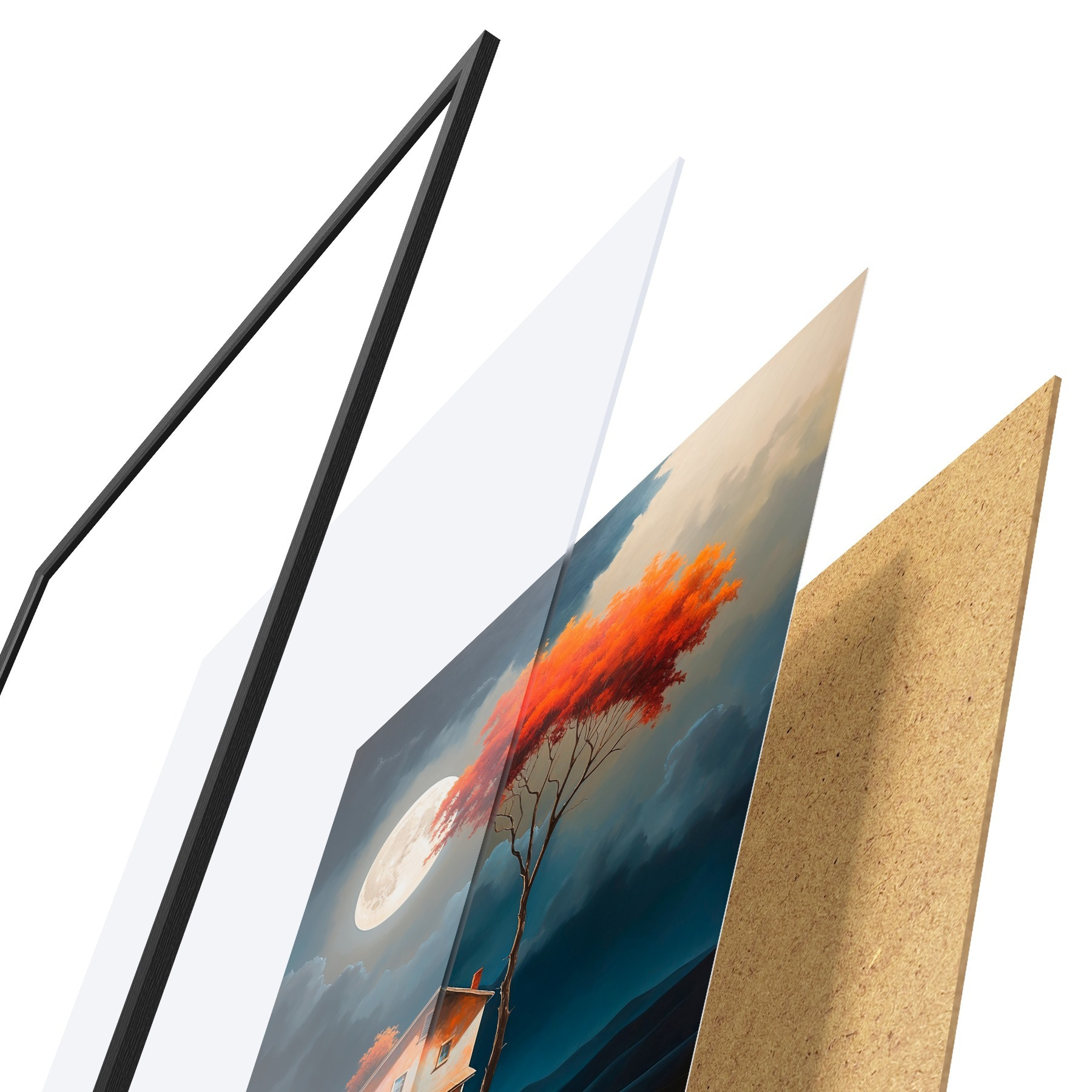 Plakatą sudaro rėmas, pleksiklas, atspausdintas vaizdas ir medžio drožlių plokštės pagrindas. Plakatą galima iš karto pakabinti ant sienos dėl kitoje pusėje esančių laikiklių.