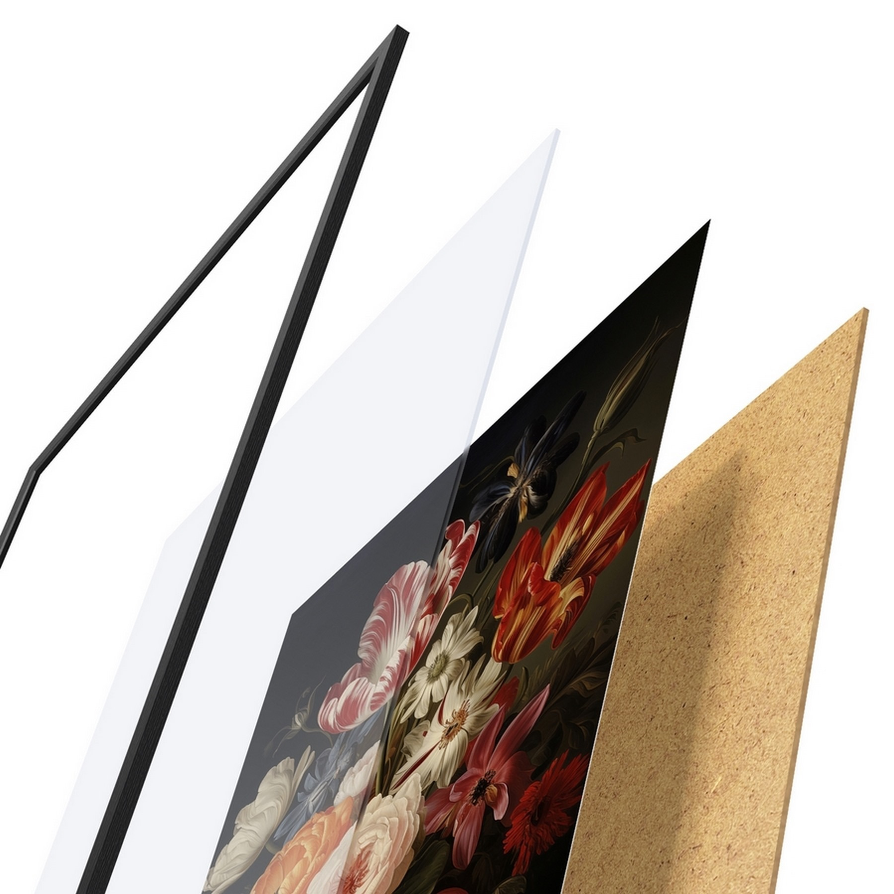 Plakatą sudaro rėmas, pleksiklas, atspausdintas vaizdas ir medžio drožlių plokštės pagrindas. Plakatą galima iš karto pakabinti ant sienos dėl kitoje pusėje esančių laikiklių.