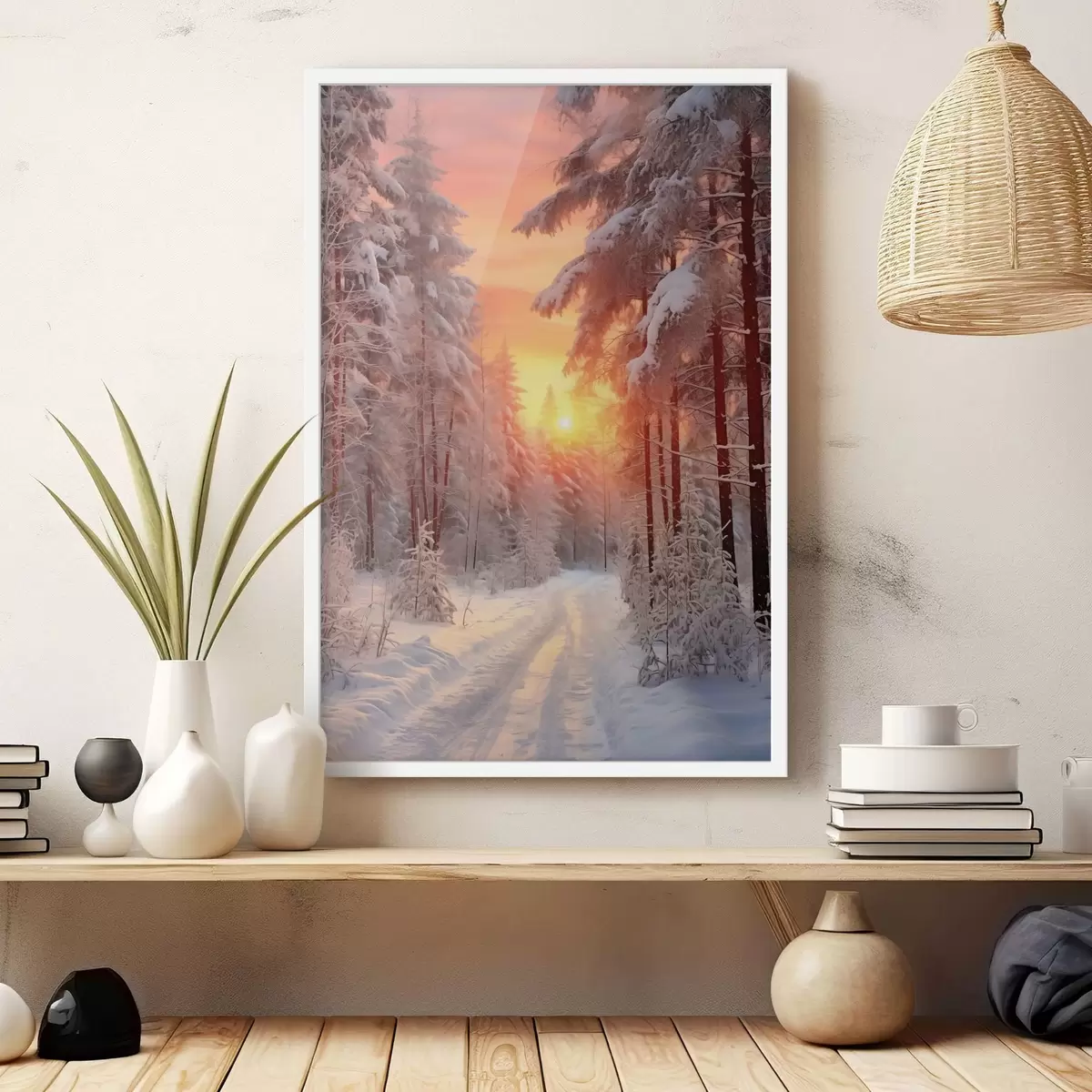 Plakatas Kelias žiemos miške, sniegas, pušys, saulėlydžio spalvos f41639