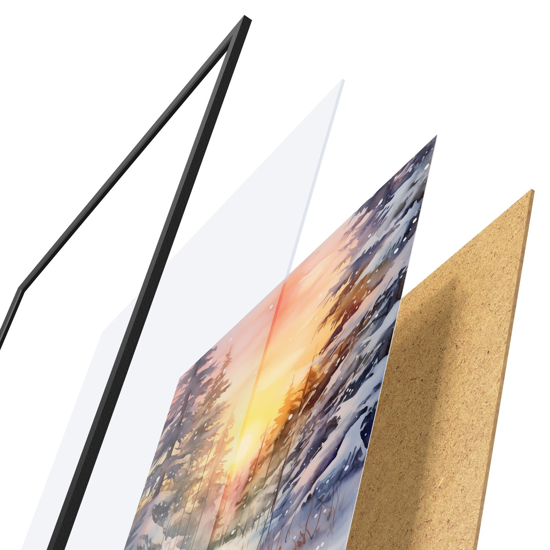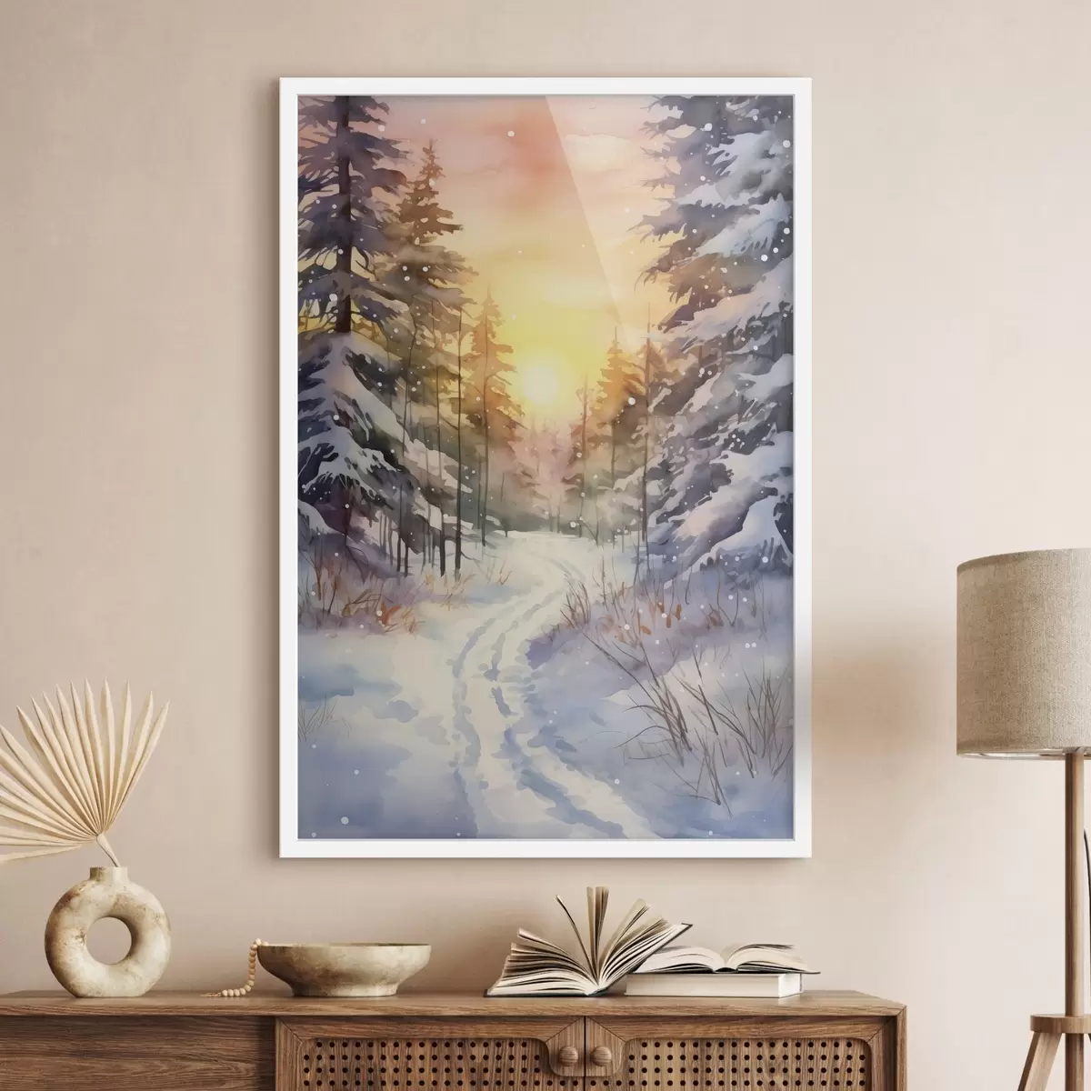 Plakatas Akvarelė žiemos miškas, snaigės, gražus dangus, saulėlydis Ne f41640
