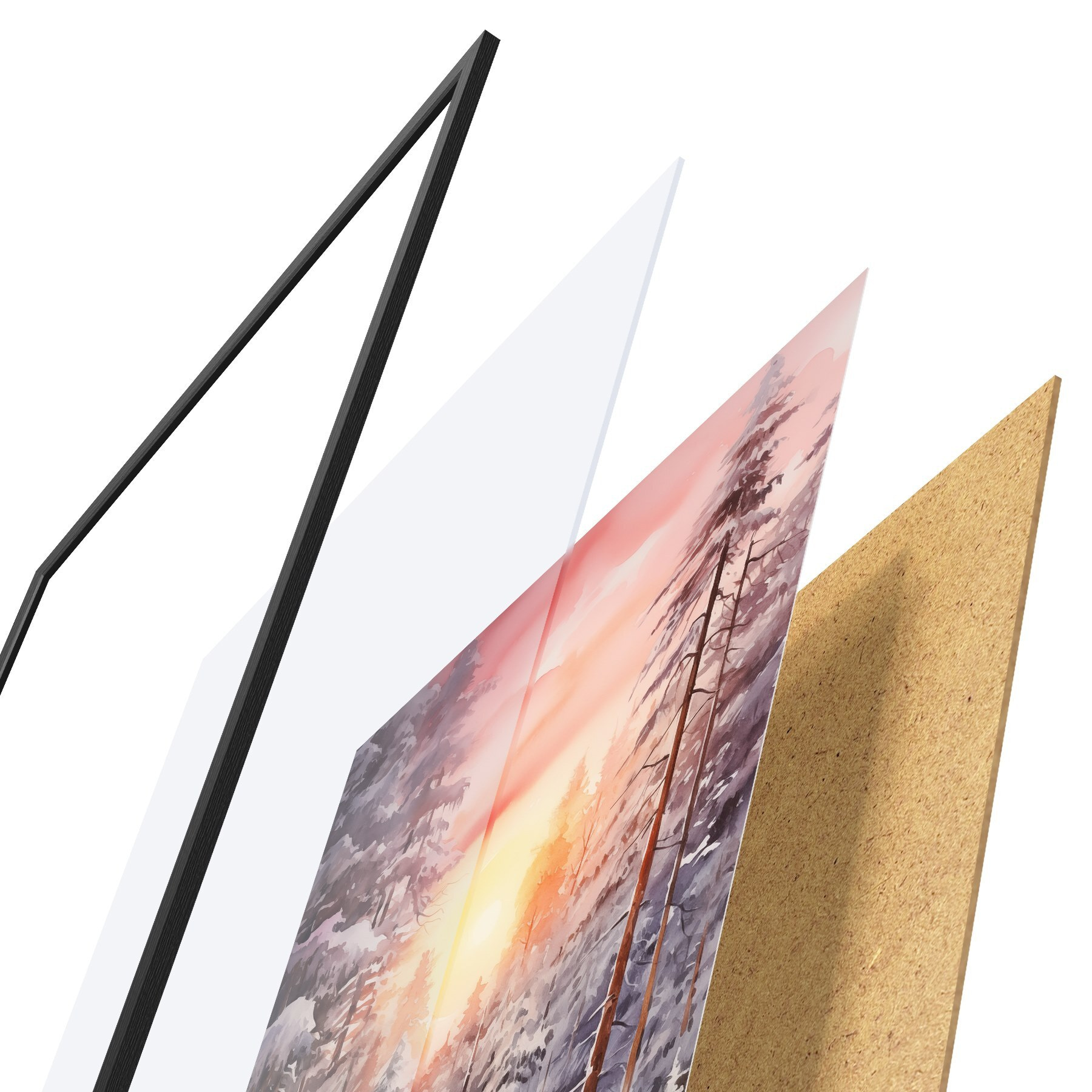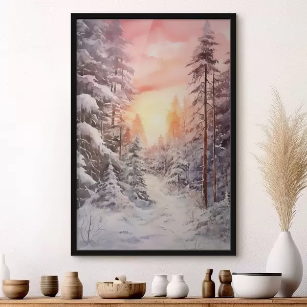 Plakatas Graži žiema, akvarelė miškas, snieguotas, medžiai, rausvas dangus, saulėlydis Ne f41641