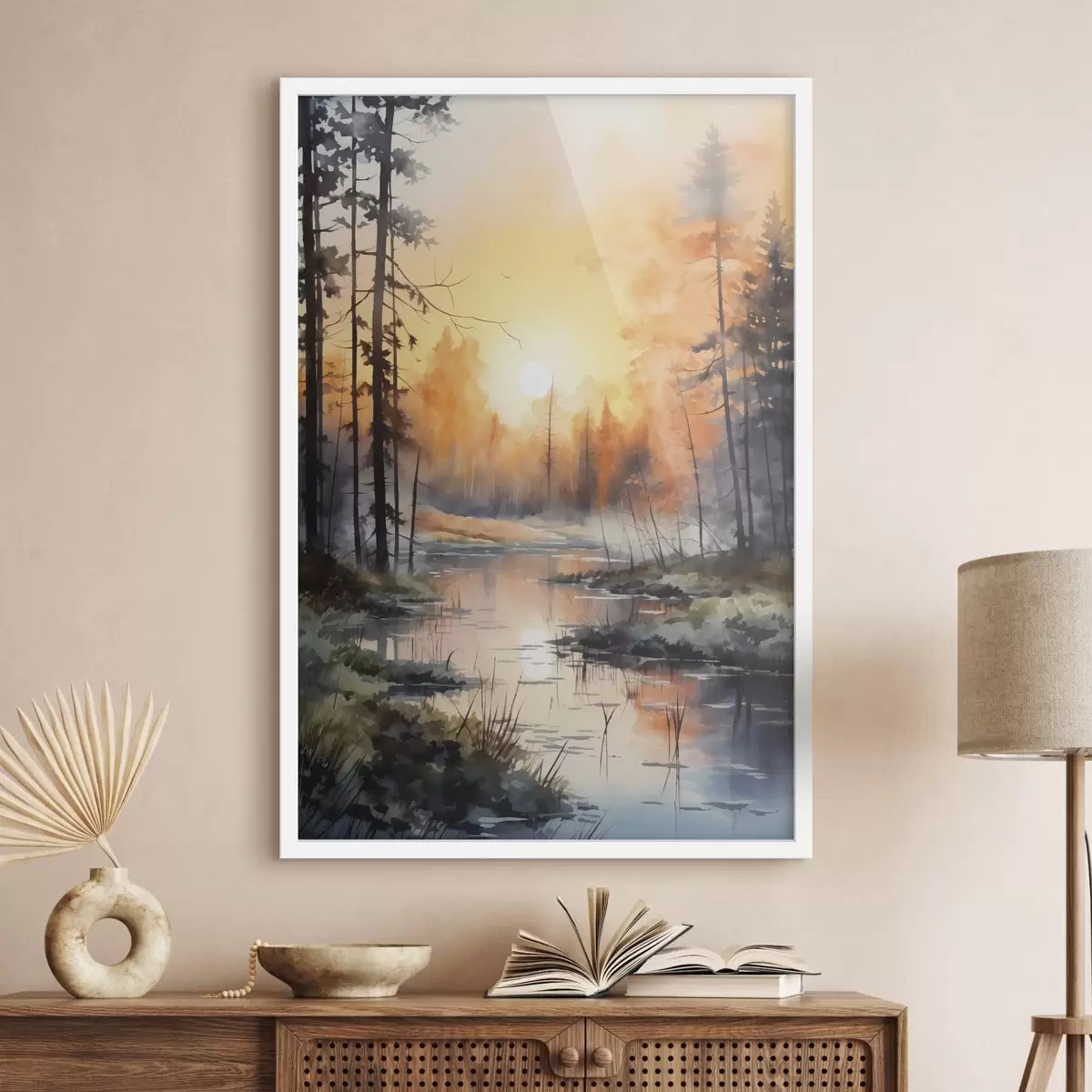 Plakatas Ežeras miške, akvarelė, rudens spalvos, rūkas, saulėlydžio dangus Ne f41642