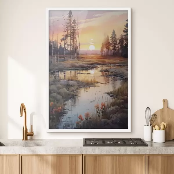 Plakatas Graži upė rudens miške, akvarelė, pieva, saulėlydžio dangus Ne f41643