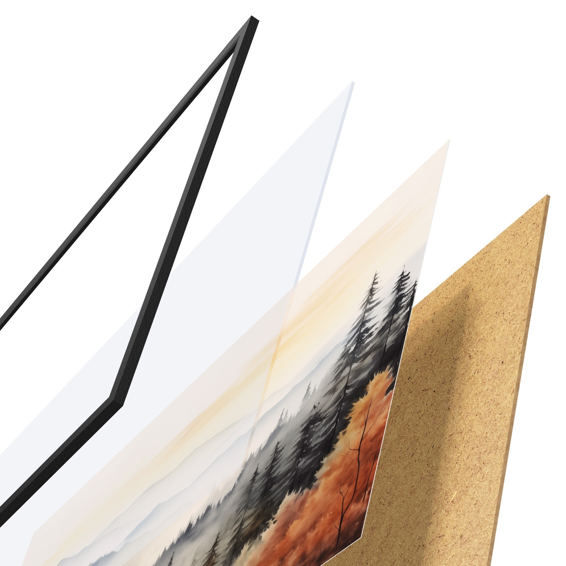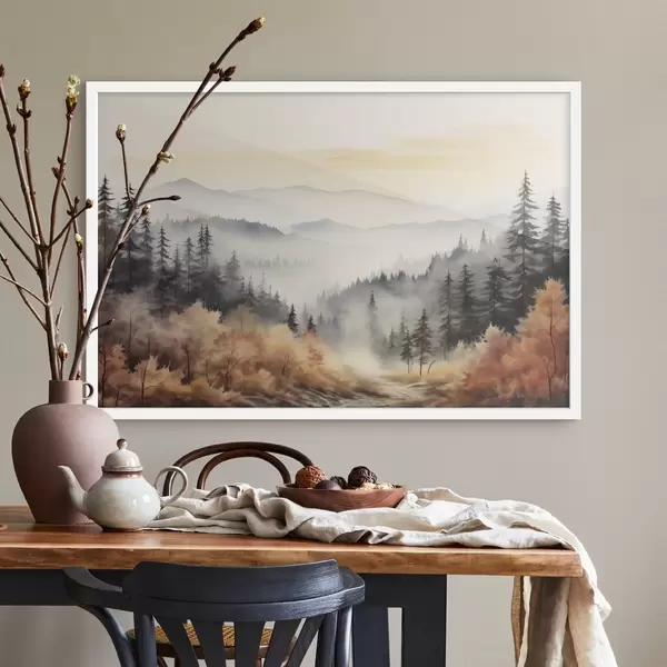 Plakatas Gražūs rūke paskendę kalnai, rudens miškas, akvarelė Ne f41646