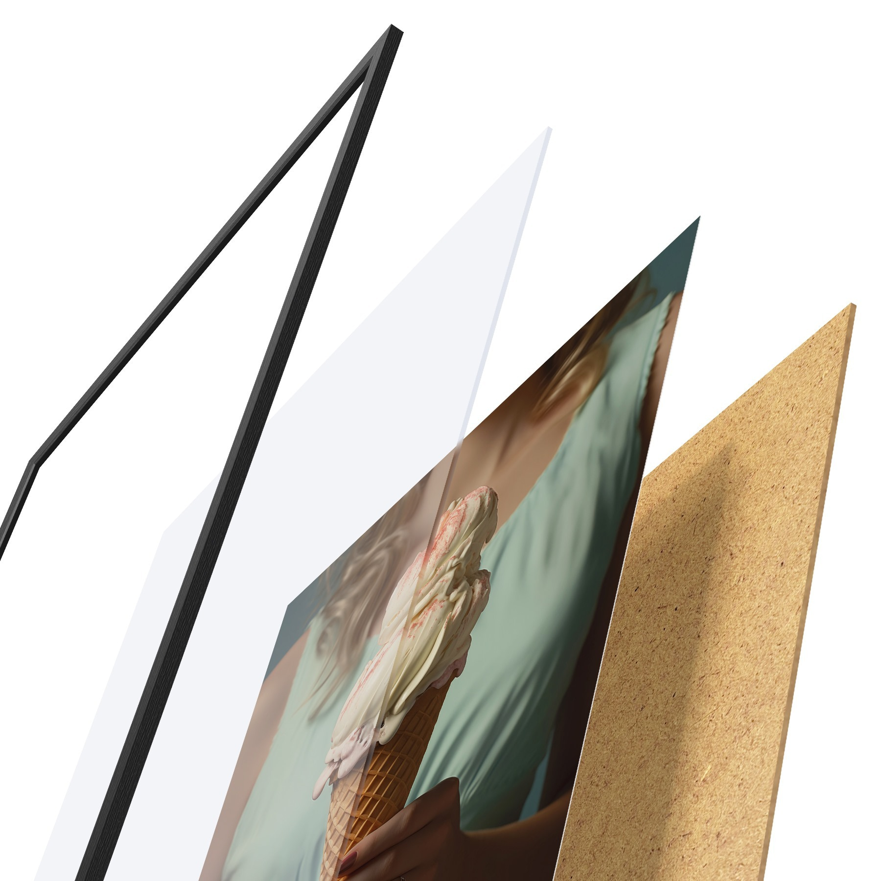 Plakatą sudaro rėmas, pleksiklas, atspausdintas vaizdas ir medžio drožlių plokštės pagrindas. Plakatą galima iš karto pakabinti ant sienos dėl kitoje pusėje esančių laikiklių.