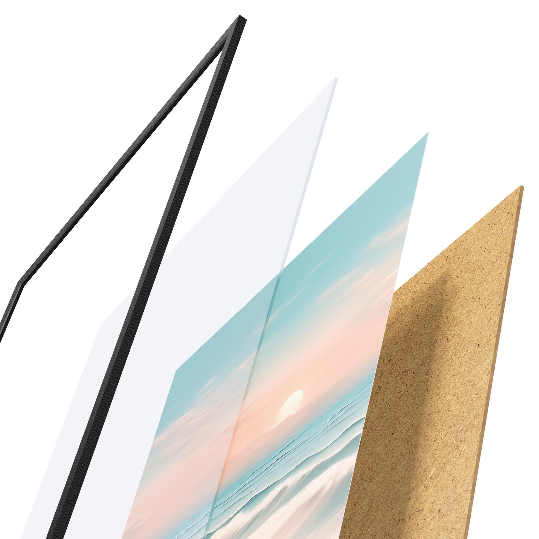 Plakatą sudaro rėmas, pleksiklas, atspausdintas vaizdas ir medžio drožlių plokštės pagrindas. Plakatą galima iš karto pakabinti ant sienos dėl kitoje pusėje esančių laikiklių.