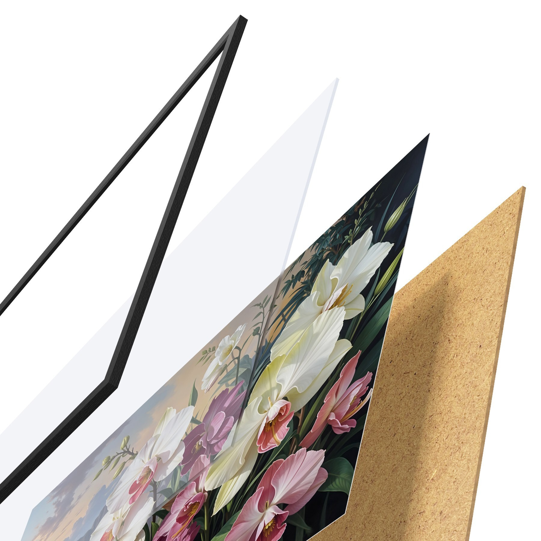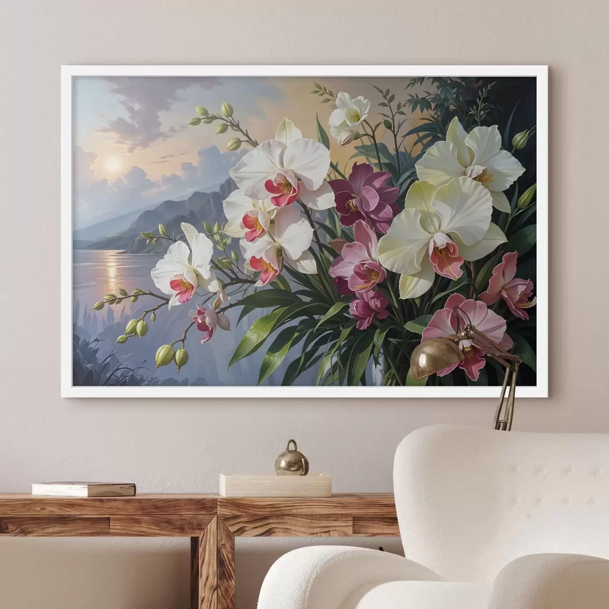 Plakatas Ryški atogrąžų gėlių puokštė su orchidėjomis ir sodria žalia lapija jūros peizažo fone f41713