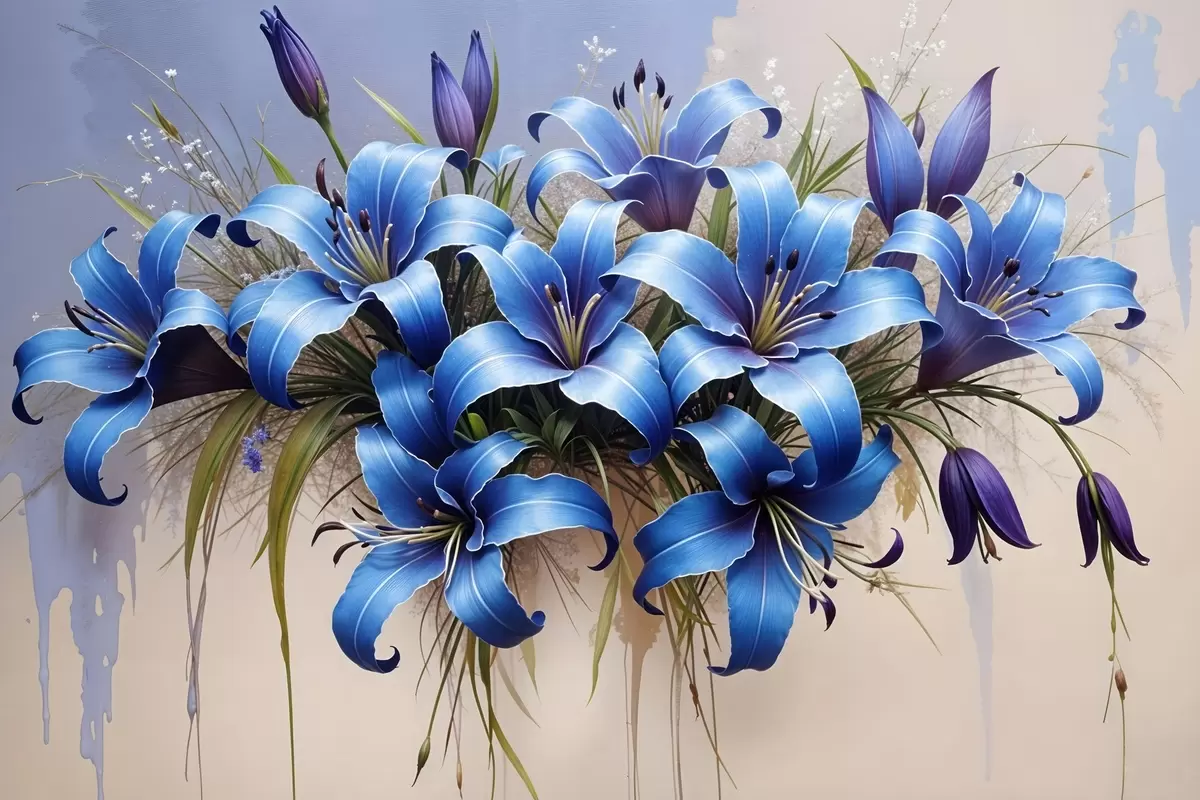 Plakatas Ryškių mėlynų ir violetinių gėlių puokštė su švelniais žiedlapiais ir žaliais lapais šviesiame fone f41714