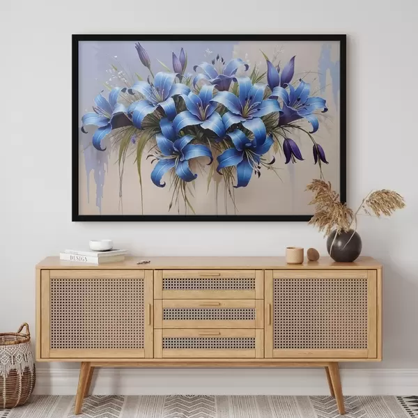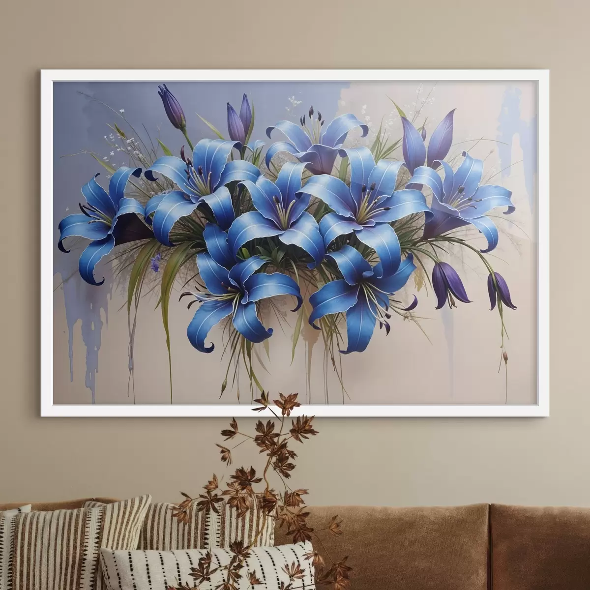 Plakatas Ryškių mėlynų ir violetinių gėlių puokštė su švelniais žiedlapiais ir žaliais lapais šviesiame fone Ne f41714