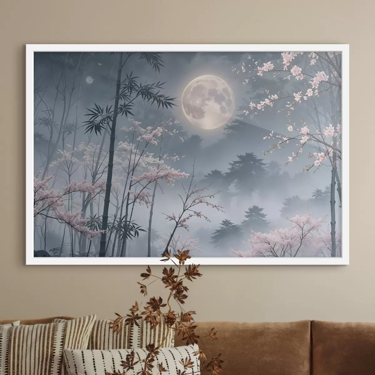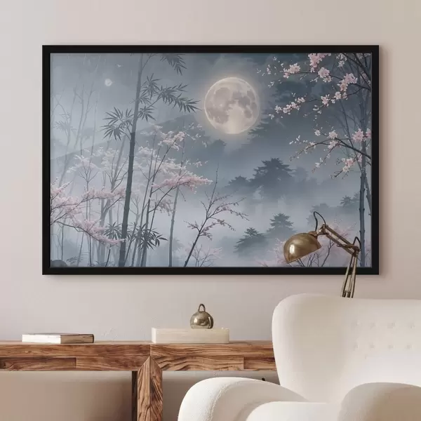 Plakatas Mėnulio pilnatis nakties danguje, apsupta bambuko medžių siluetų ir žydinčių vyšnių šakų f41717