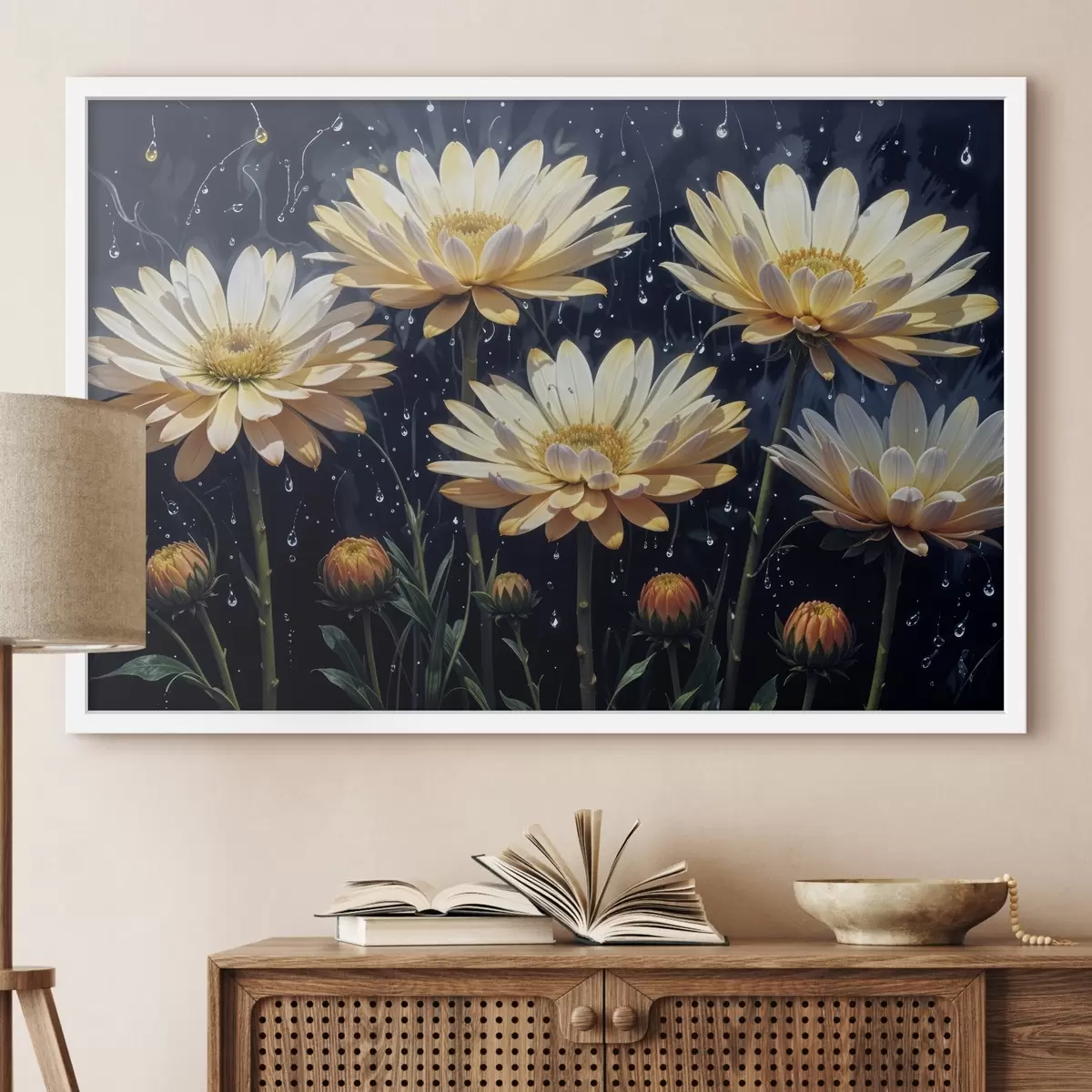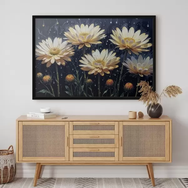 Plakatas Didelių geltonų margučių gėlių laukas su baltais žiedlapiais tamsiame nakties danguje su žvaigždėmis f41718