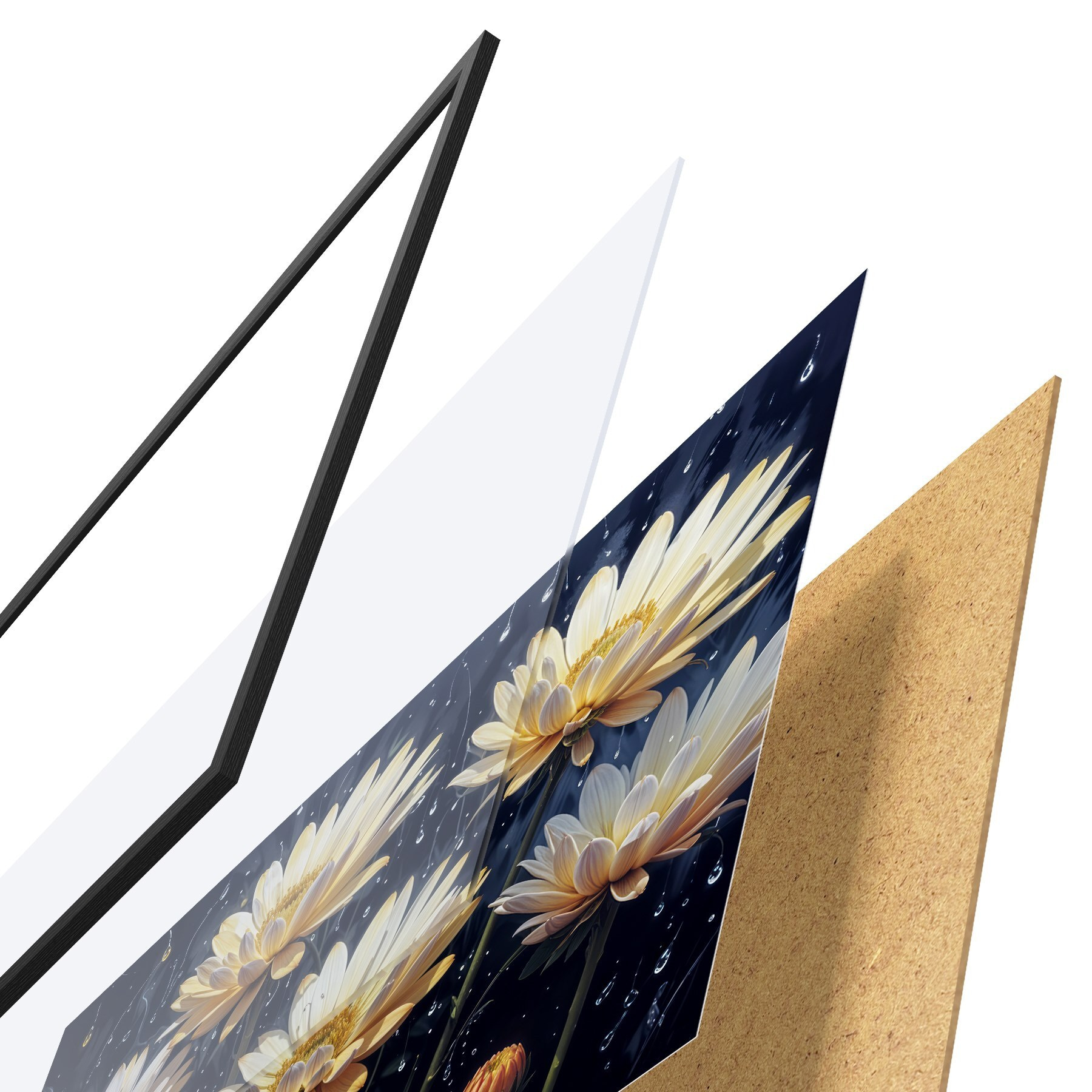 Plakatas Didelių geltonų margučių gėlių laukas su baltais žiedlapiais tamsiame nakties danguje su žvaigždėmis Ne f41718