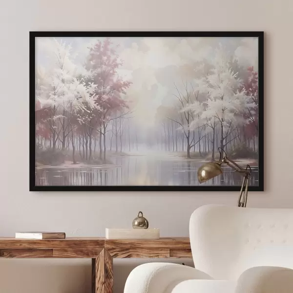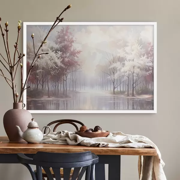 Plakatas Ramus kraštovaizdis su miglotu mišku, plikais medžiais ir ramiu ežeru, kuriame atsispindi švelnūs rausvi ir balti tonai f41720