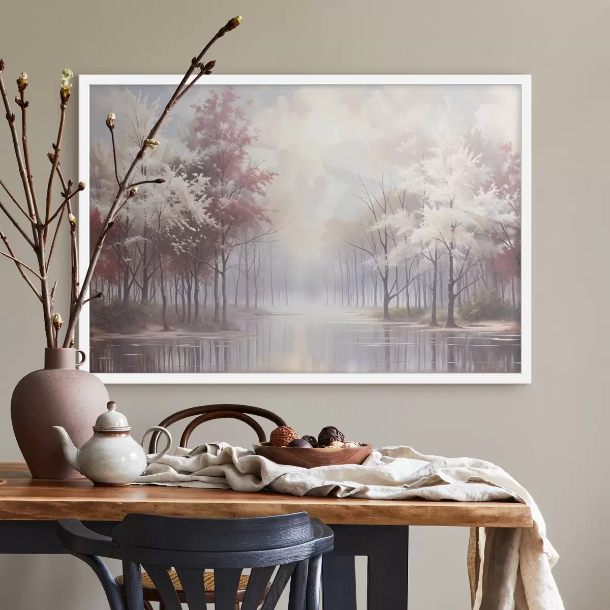Plakatas Ramus kraštovaizdis su miglotu mišku, plikais medžiais ir ramiu ežeru, kuriame atsispindi švelnūs rausvi ir balti tonai Ne f41720