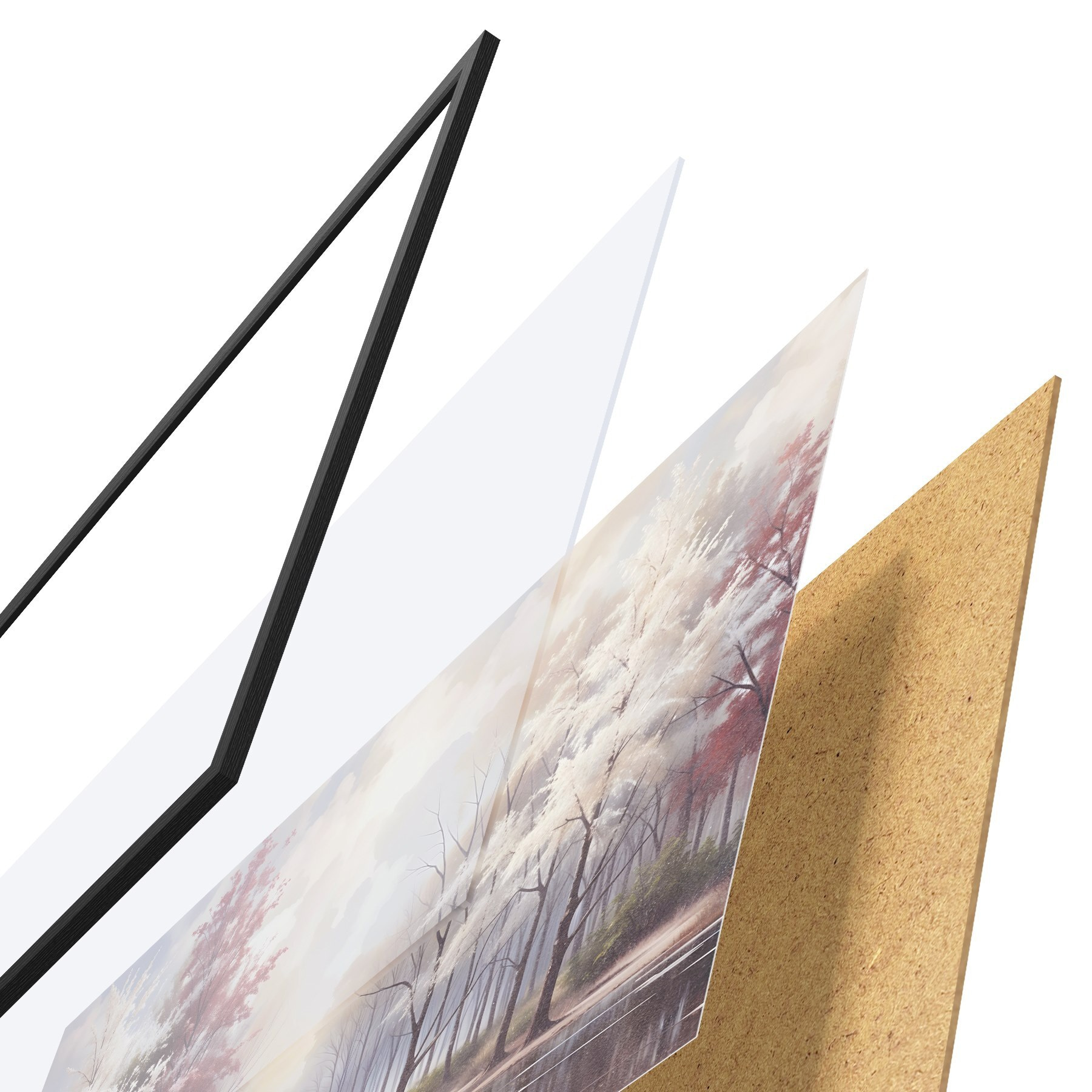 Plakatą sudaro rėmas, pleksiklas, atspausdintas vaizdas ir medžio drožlių plokštės pagrindas. Plakatą galima iš karto pakabinti ant sienos dėl kitoje pusėje esančių laikiklių.