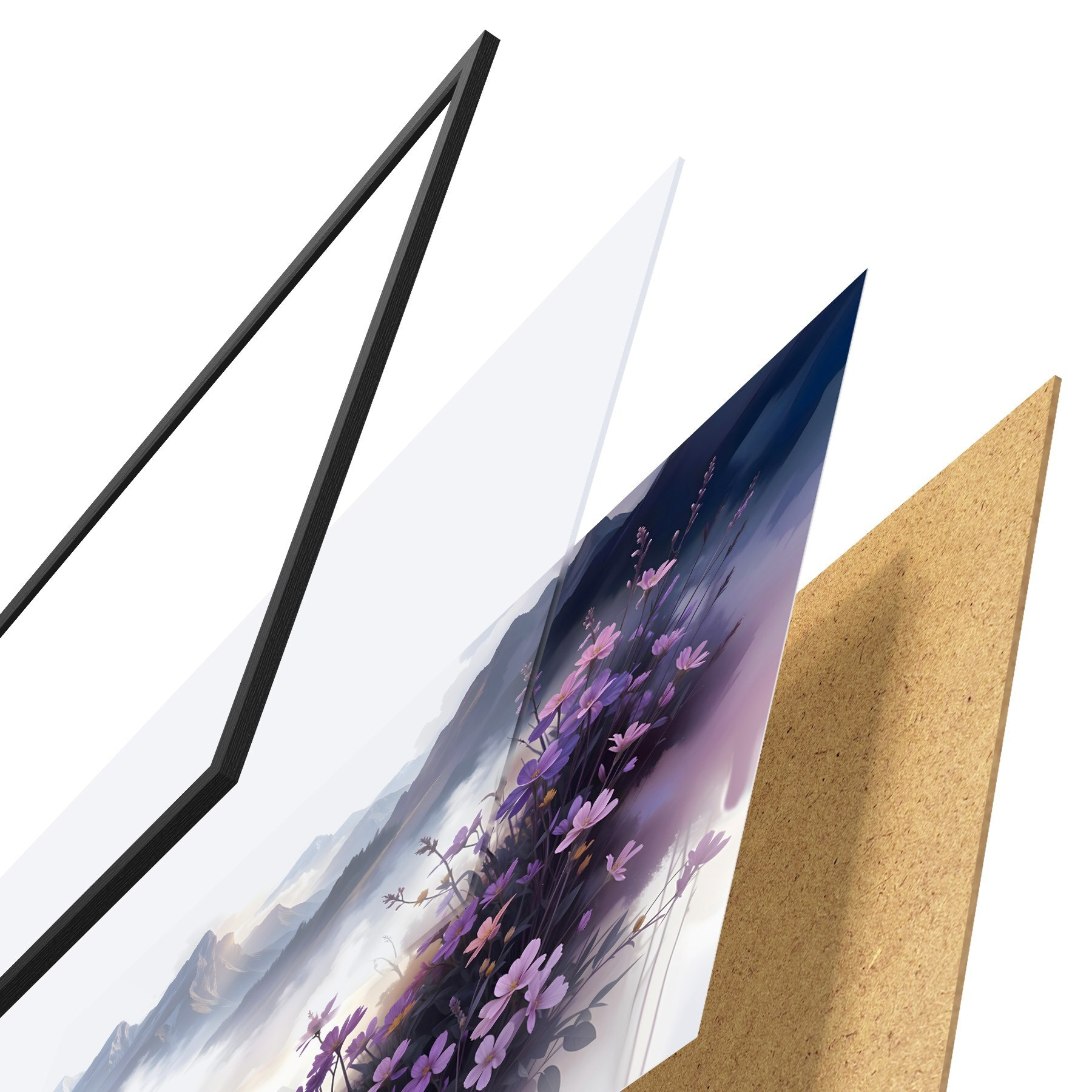 Plakatas Peizažas su kalnų grandine fone, apsuptas sodrių violetinių gėlių pirmame plane f41724