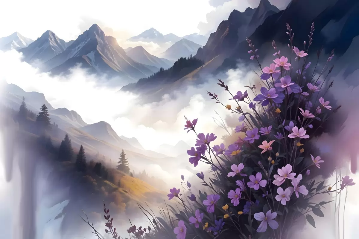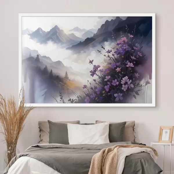 Plakatas Peizažas su kalnų grandine fone, apsuptas sodrių violetinių gėlių pirmame plane f41724