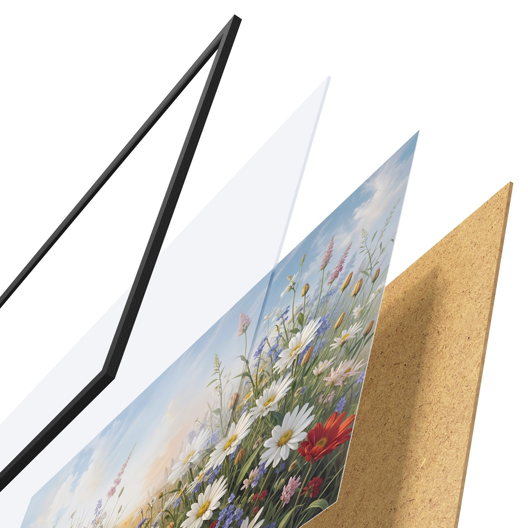 Plakatas Spalvingas laukinių gėlių laukas, kuriame žydi saulutės, aguonos ir kiti augalai mėlyno dangaus fone f41725