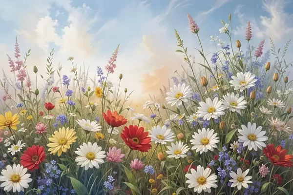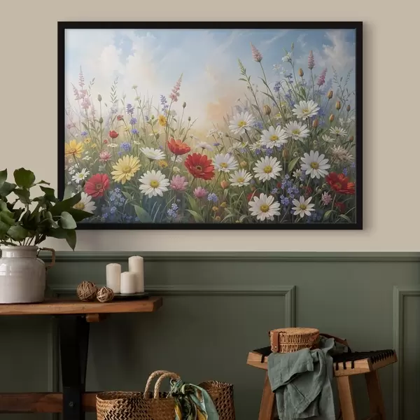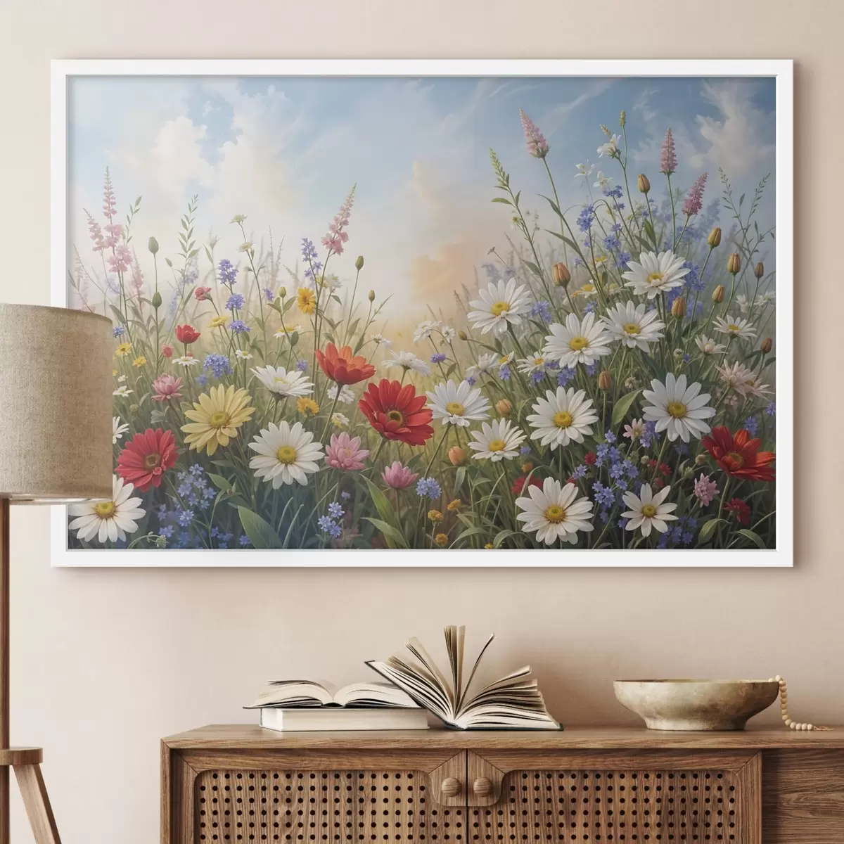 Plakatas Spalvingas laukinių gėlių laukas, kuriame žydi saulutės, aguonos ir kiti augalai mėlyno dangaus fone f41725